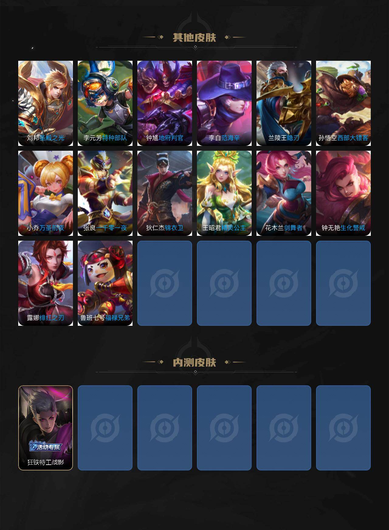 【限定皮肤】:蒙犽顽岩魄,大乔绒语心约,姜子牙天穹之誓,狄仁杰阴阳师,赵云皇家上将,吕布猎兽之王,元歌无心,马可波罗暗影游猎,狄仁杰魔术师,项羽海滩派对,李元芳匿光侦查者,李元芳云中旅人,雅典娜单词大作战,裴擒虎李小龙,云中