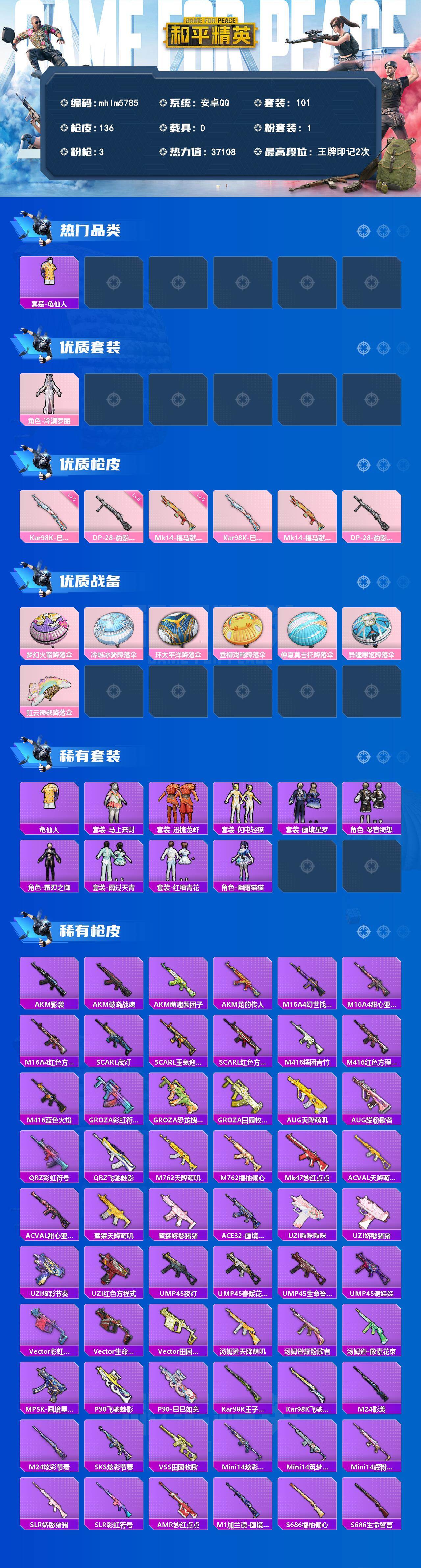 【mhlm5785】安卓 手Q-1粉装-3特效枪-0载具-0粉色飞行器-37108热力值-2王牌印记-101套装-136枪皮