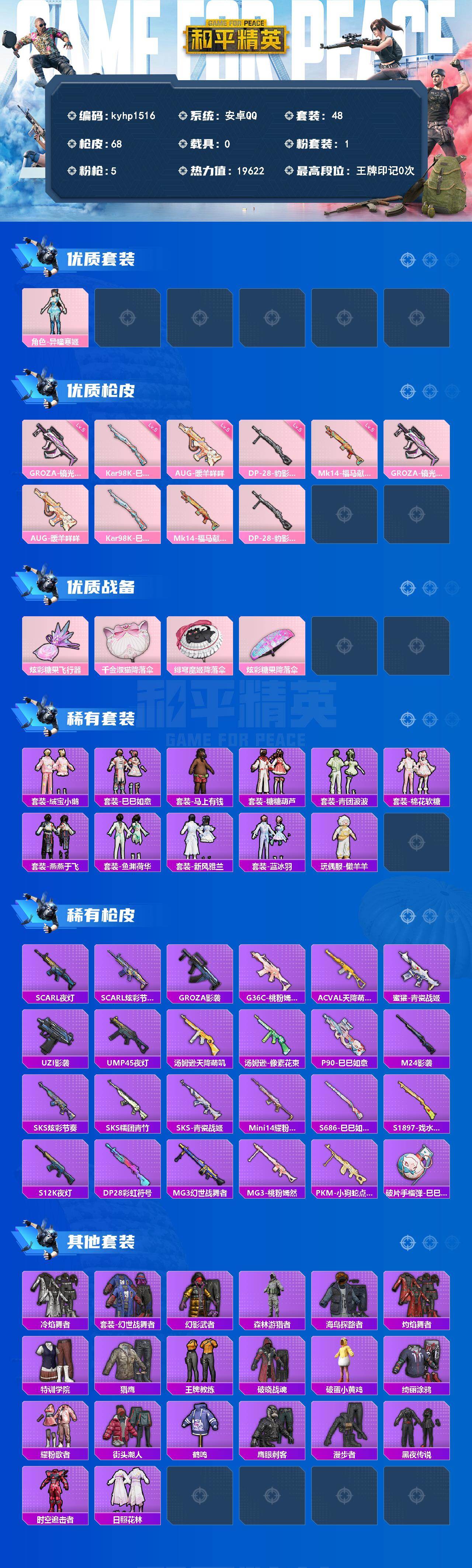 安卓 手Q-1粉装-5特效枪-0载具-1粉色飞行器-19622热力值-1王牌印记-48套装-68枪皮