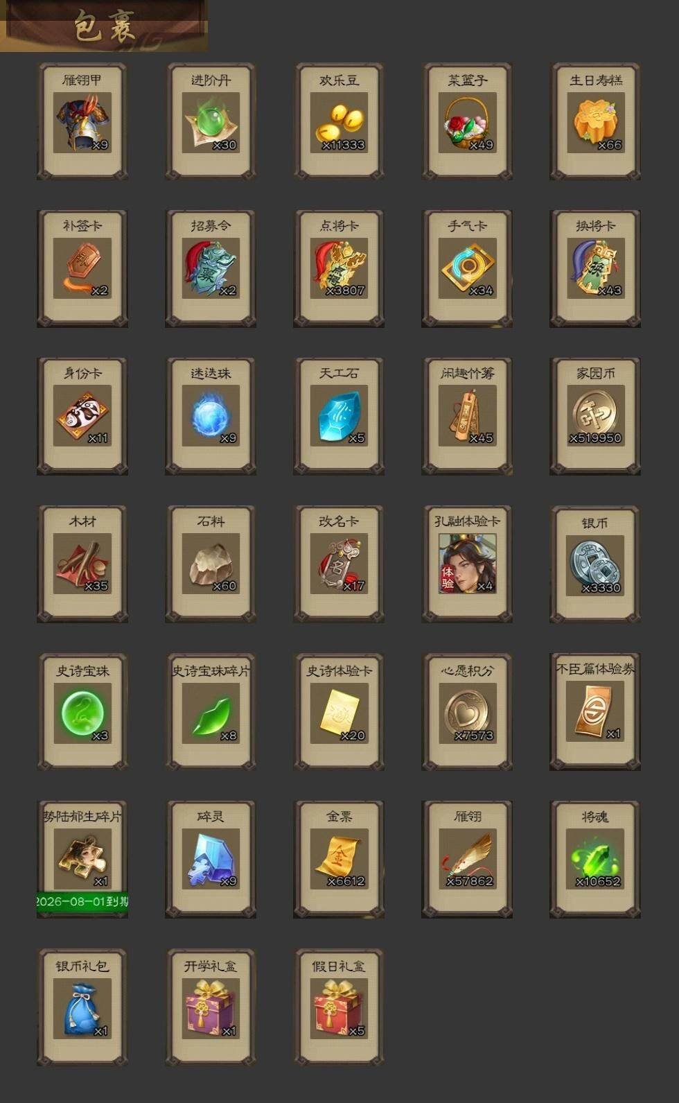 官阶:大将军;VIP等级:VIP11;史诗武将数量:38;动态皮肤数量:42;武将总数:366;史诗宝珠数量:3;将魂数量:10652;神将:2;魏国史诗武将:23;蜀国史诗武将:7;吴国史诗武将:12;群史诗武将:12