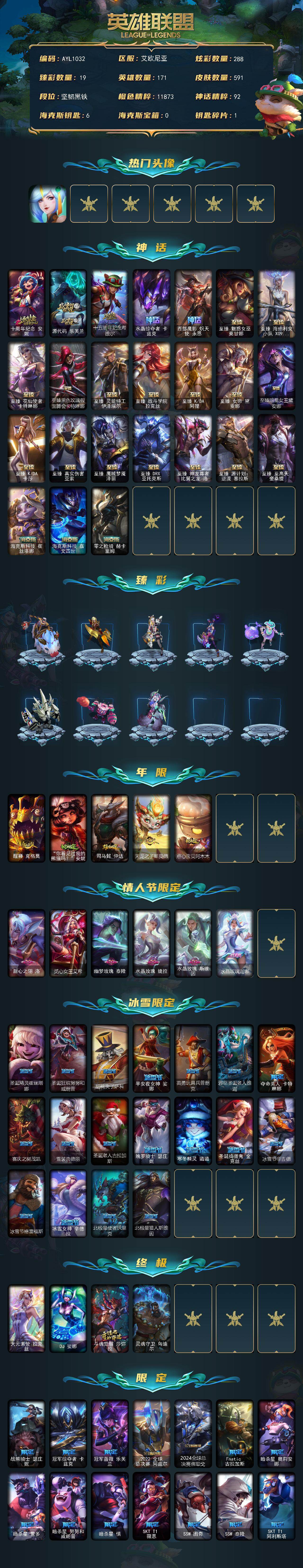 【店主推荐捡漏号】未定级段位-171英雄-591皮肤-288炫彩-4终极-24神话-98限定-65传说-98史诗