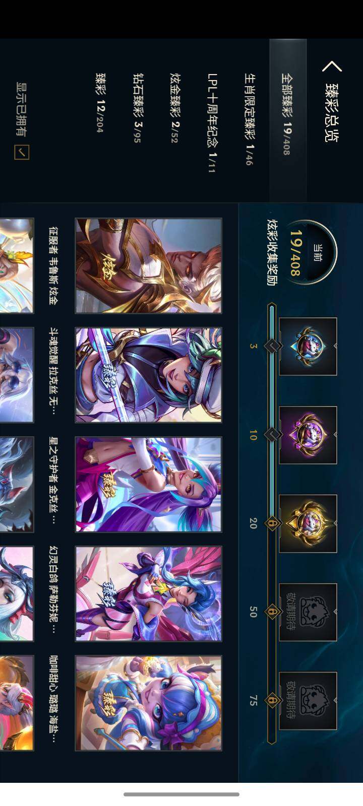 【至臻皮肤】:至臻魅惑女巫莫甘娜,至臻海珀利安小队X09星环灵风迦娜,至臻花仙使者卡特琳娜,至臻黑色玫瑰假面舞会卡特琳娜,至臻灵能特工伊泽瑞尔,至臻战斗学