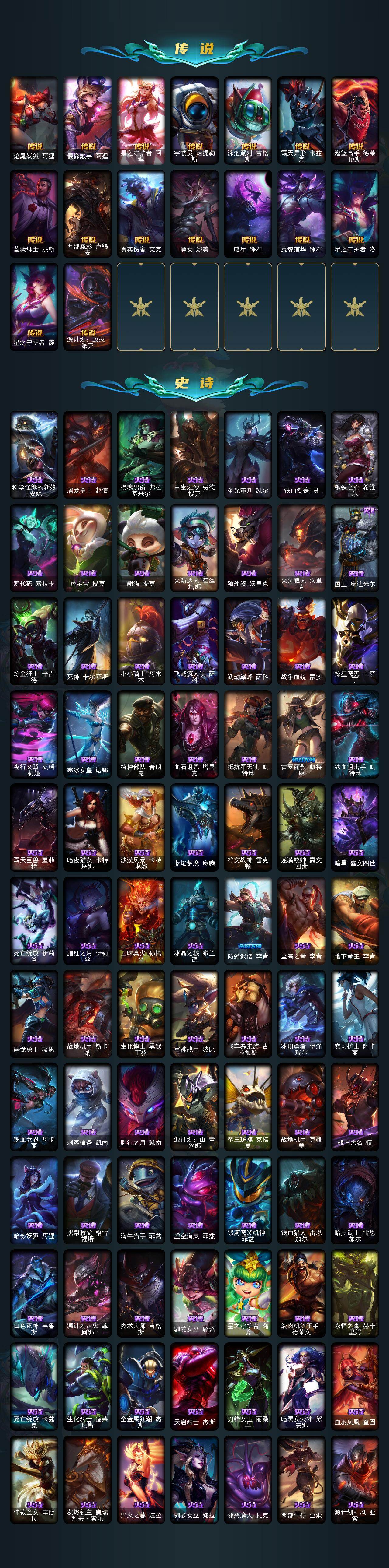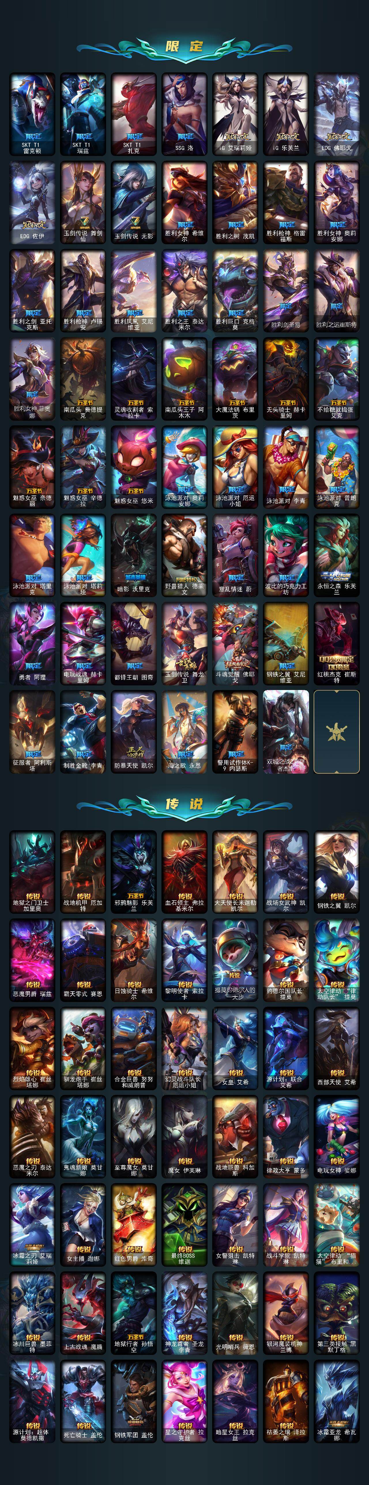 【神话皮肤】:十周年纪念安妮,源代码乐芙兰,十五周年纪念希维尔,水晶掠夺者卡兹克,西部魔影炽天使永恩