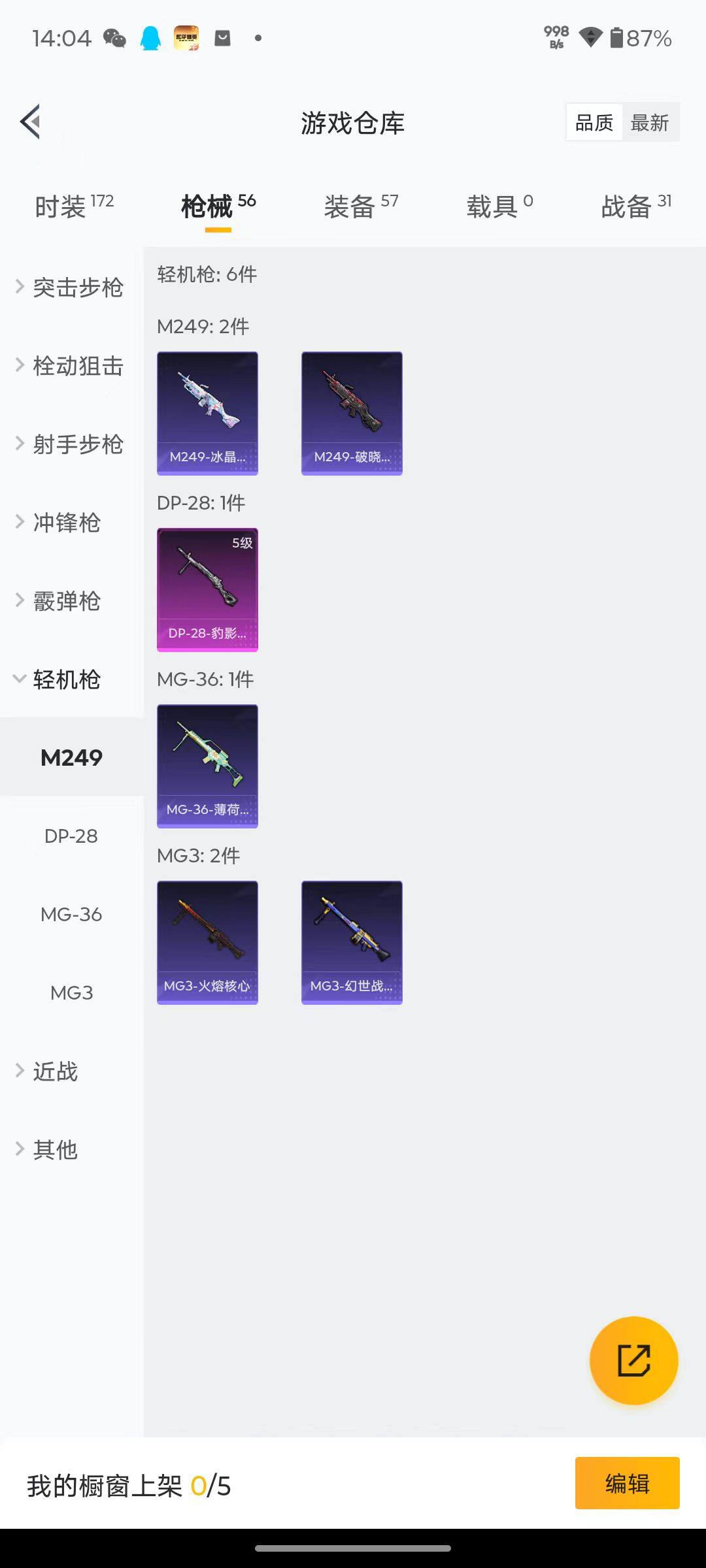 38套装/枪械3/装备57/战备31/热力值12246/二级Kar98K-巳巳如意/五级AA12-G-萌骑幻想/五级DP-28-豹影疾电/小丑鱼/Kar98K-巳巳如意/AA12-G-萌骑幻想/DP-28-豹影疾电/炫彩糖果降落伞/套装-雪国风尚/套装-马上有钱/套装-迅捷龙虾/AKM-影袭/SCAR-L-夜灯/SCAR-L-炫彩节奏/M416-蓝色火焰/AUG-耀粉歌者/MK47-洛神天依/U