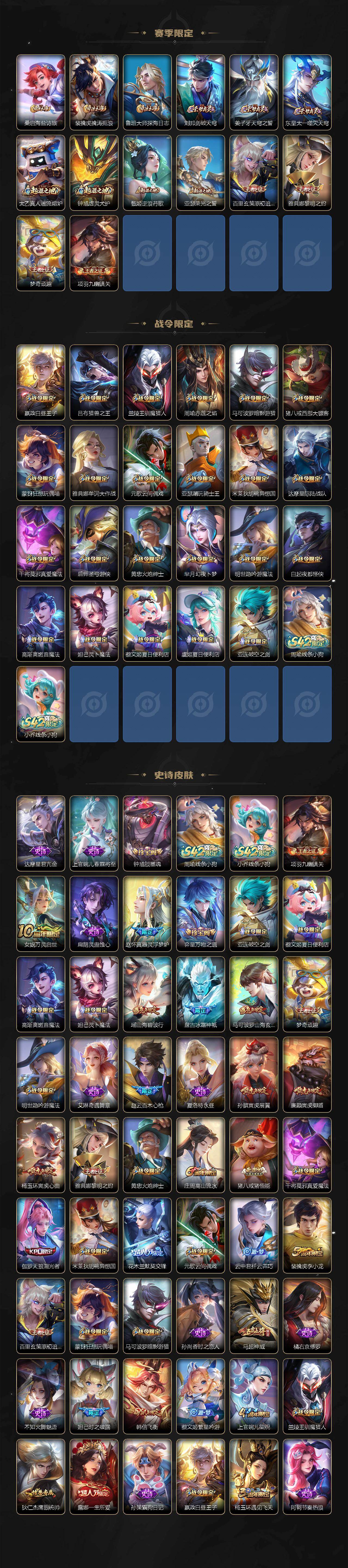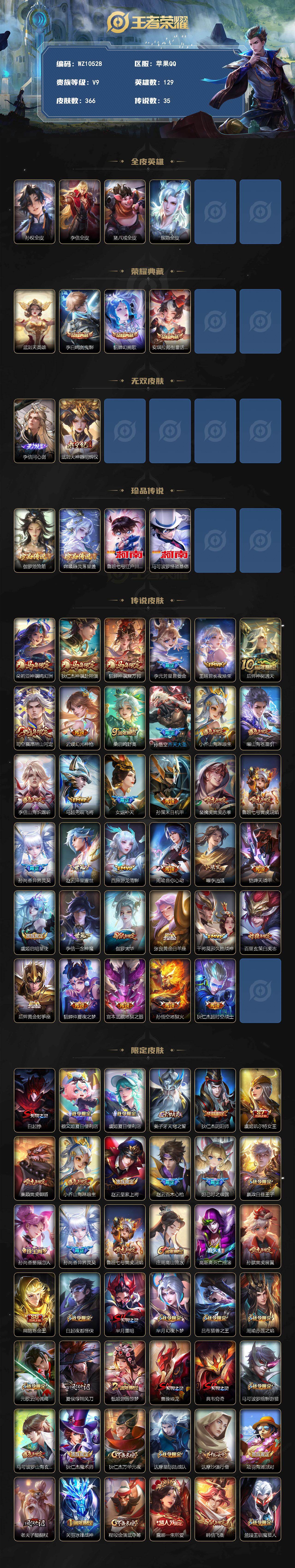 /苹果Q-V9-最强王者段位-129英雄-366皮肤-3典藏皮肤-1典藏英雄-2无双-4珍品传说-35传说-94史诗