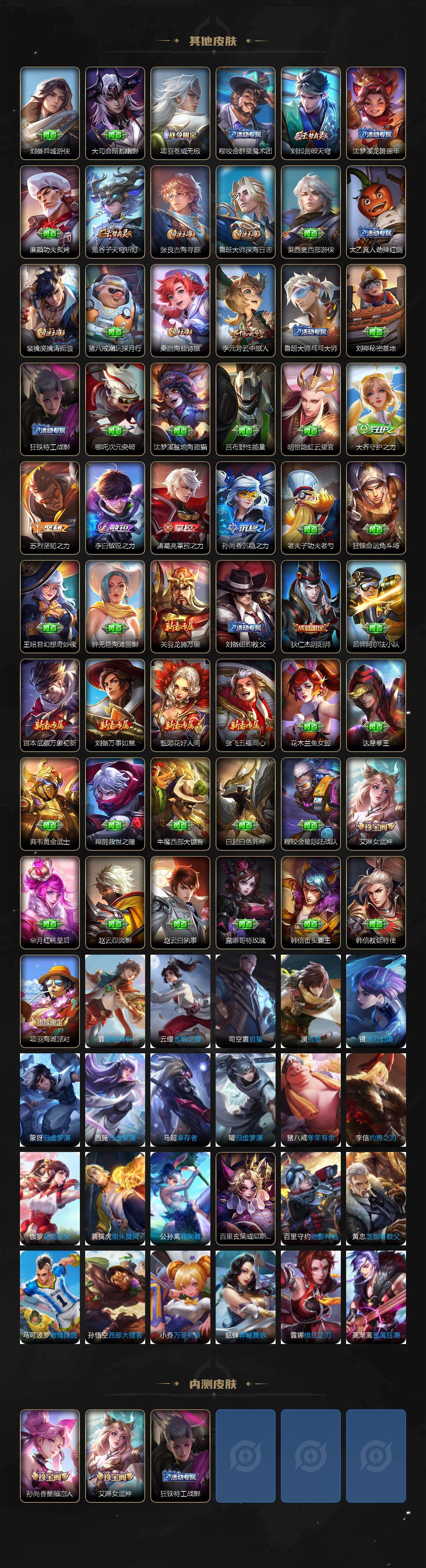 【传说皮肤】:朵莉亚神骥鸣幻洲,王昭君长夜焕生,公孙离云诺千山,澜愿照九州拓,虞姬愿照岁时盈,桑启鸣野蒿,露娜霜月吟,小乔山海琳琅生,马超无双飞将,李信一念神魔,干将莫