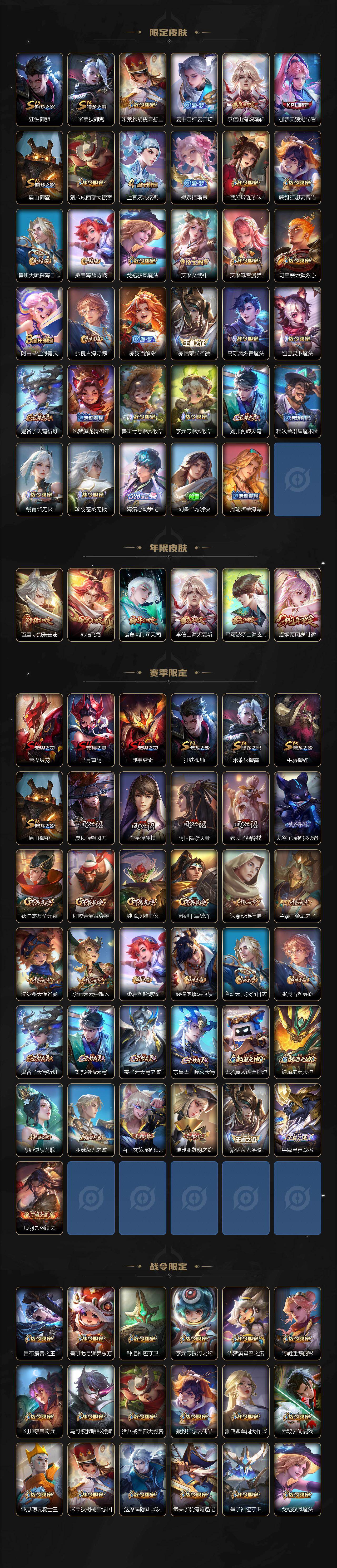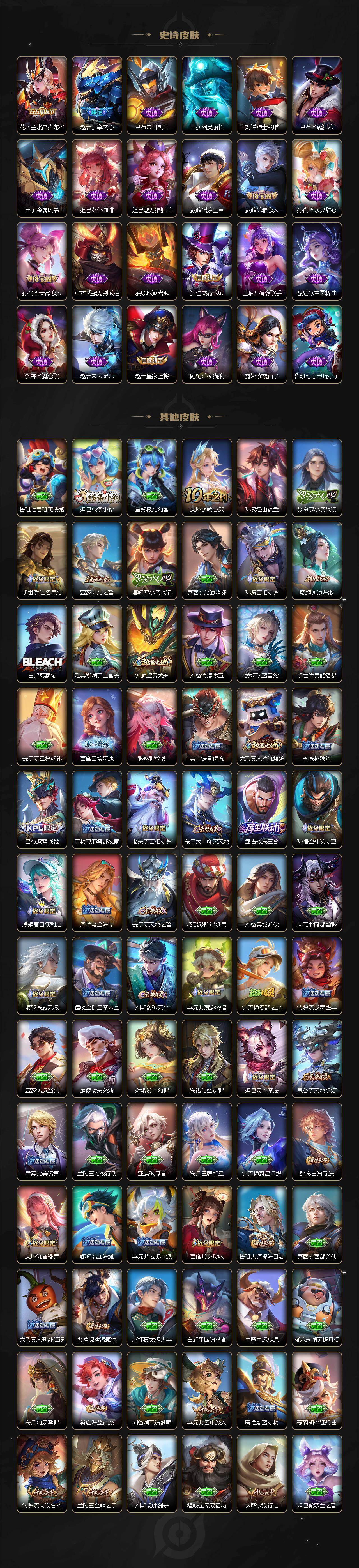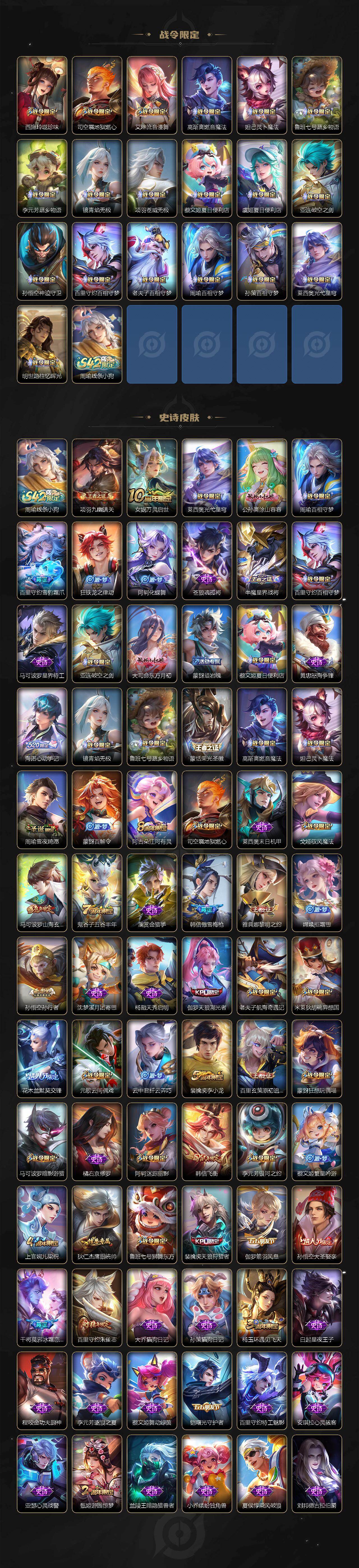 【传说皮肤】:公孙离云诺千山,虞姬愿照岁时盈,云缨幻光神枪,桑启鸣野蒿,马可波罗妄想实况,李信山海炽霜斩,诸葛亮时雨天司,虞姬启明星使,孙悟空零号赤焰,曜云鹰飞将,刘备时之恋人,狄仁杰超时空战士