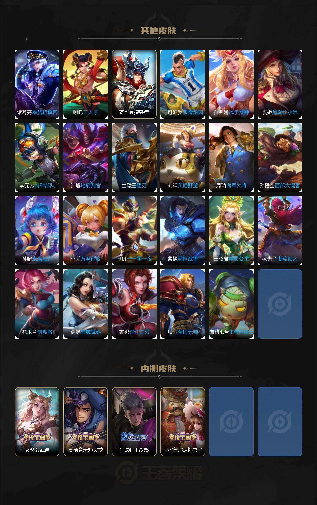 【传说皮肤】:澜愿照九州拓,云缨幻光神枪,曜山海苍雷引,李信山海炽霜斩,马超无双飞将,干将莫邪久胜战神,达摩黄金狮子座,后羿黄金射手座,李白凤求凰,孙尚香末日机甲