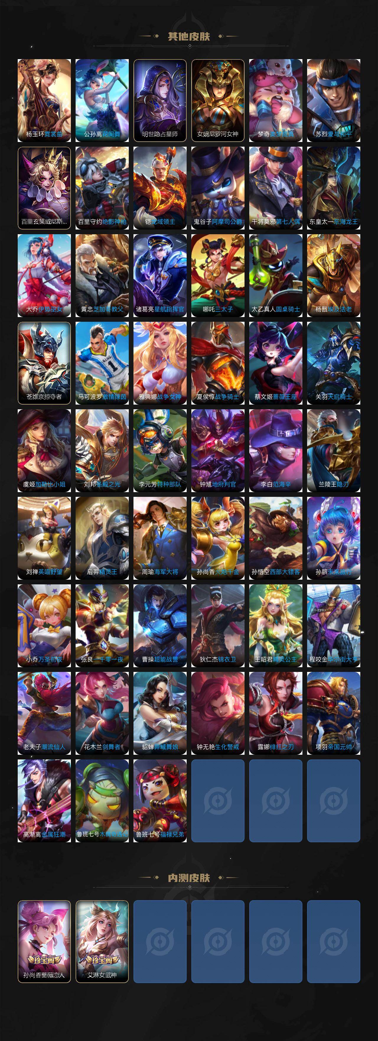 【传说皮肤】:后羿神树通天,诸葛亮时雨天司,虞姬启明星使,孙悟空零号赤焰,貂蝉猫影幻舞,梦奇胖达荣荣,孙