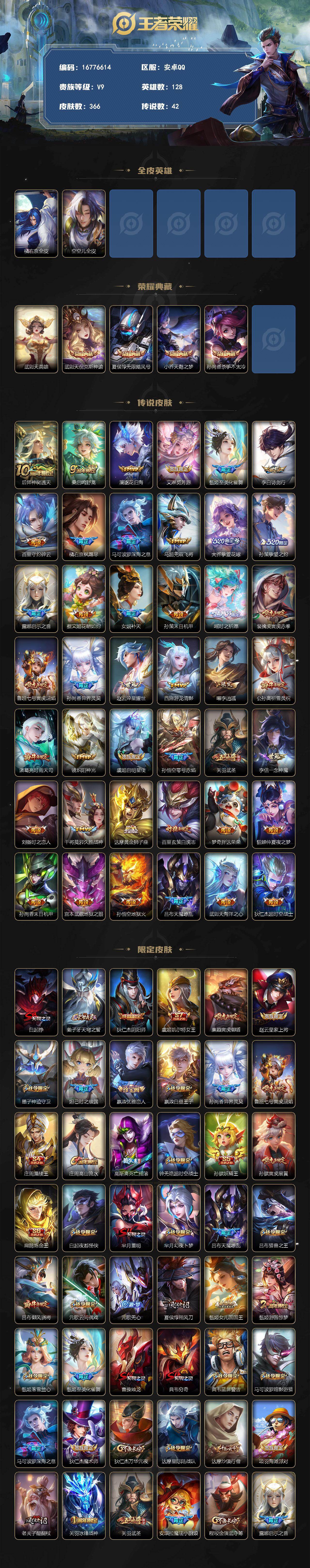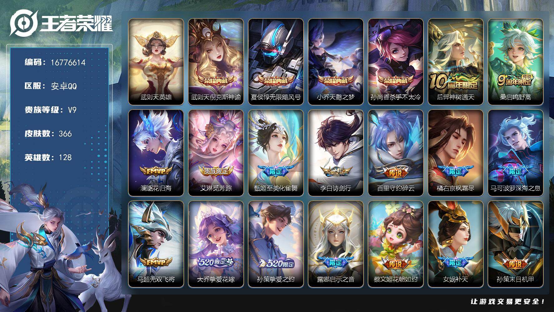 16776614】安卓Q-V9-永恒钻石III段位-128英雄-366皮肤-4典藏皮肤-1典藏英雄-42传说-105史诗