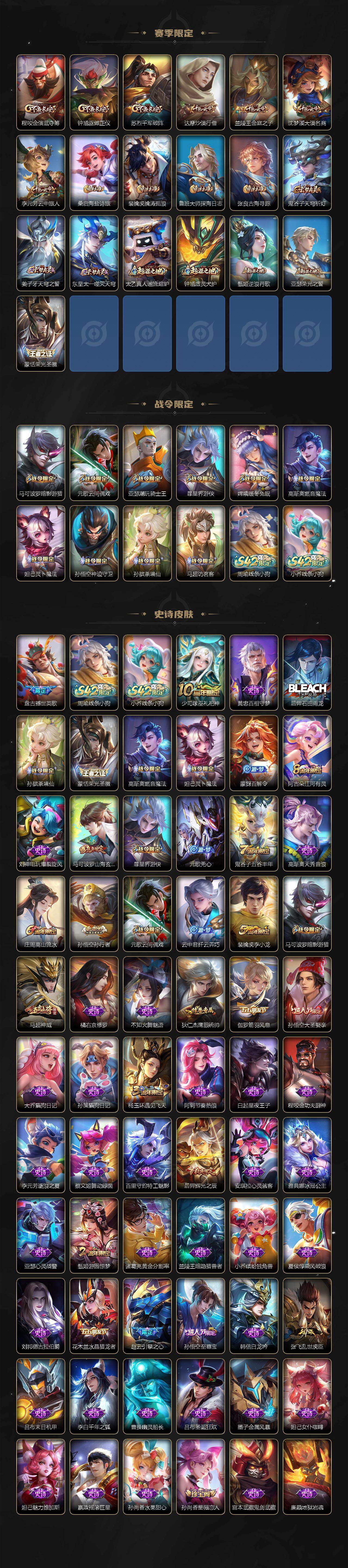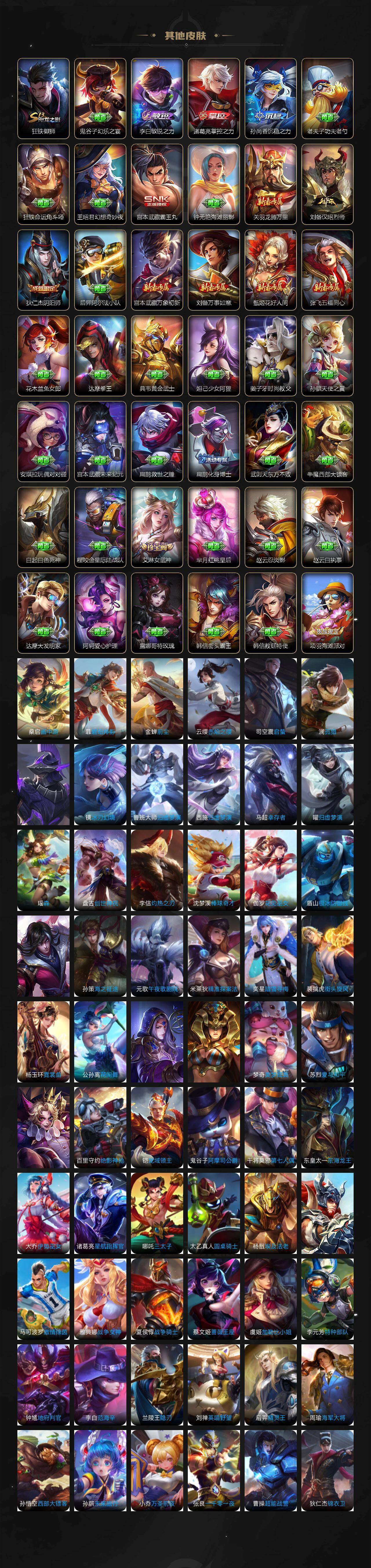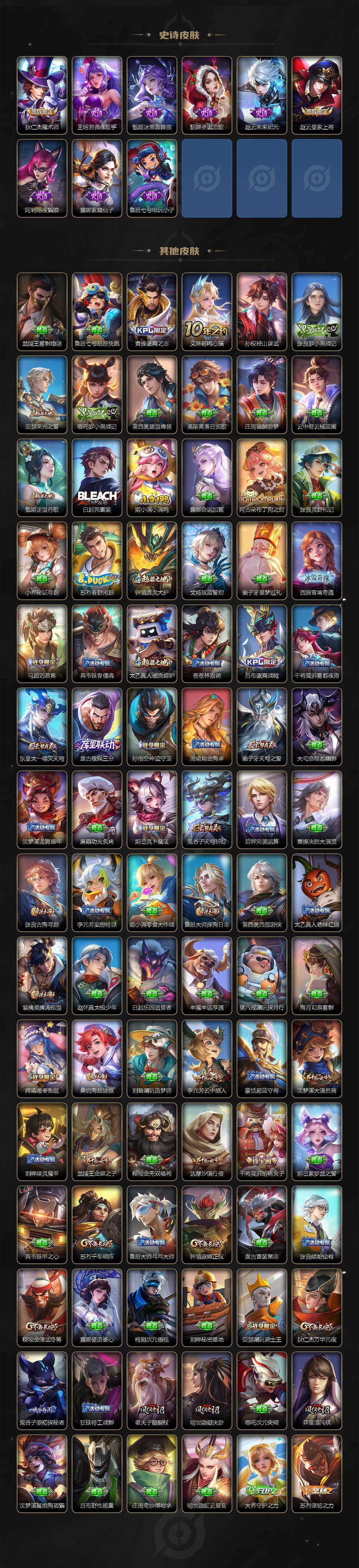 【传说皮肤】:桑启鸣野蒿,孙悟空齐天大圣,曜山海苍雷引,李信山海炽霜斩,吕布怒海麟威,百里守约碎云,王昭君乞巧织情,周瑜音你心动,铠绛天战甲