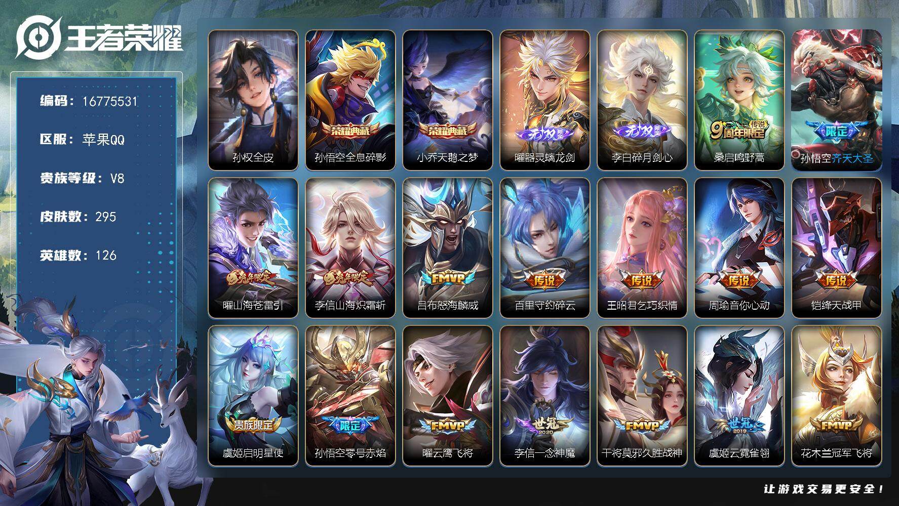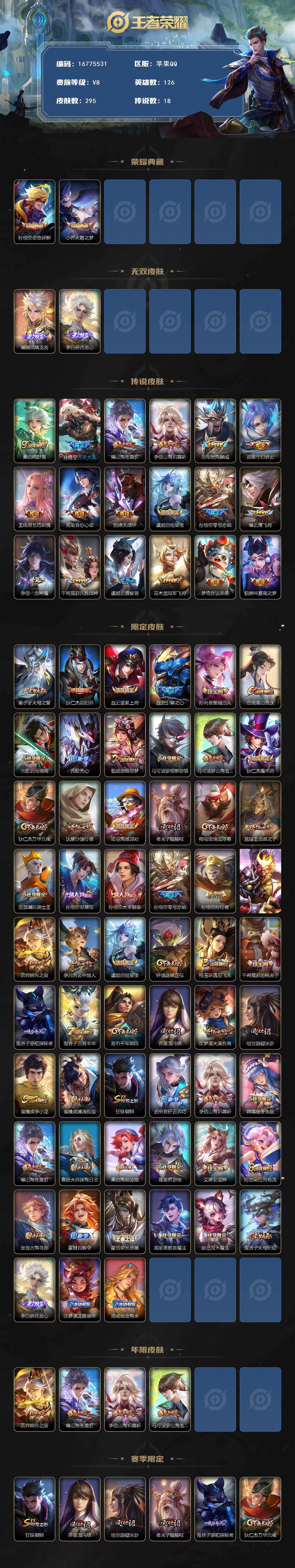 【16775531】苹果Q-V8-至尊星耀III段位-126英雄-295皮肤-