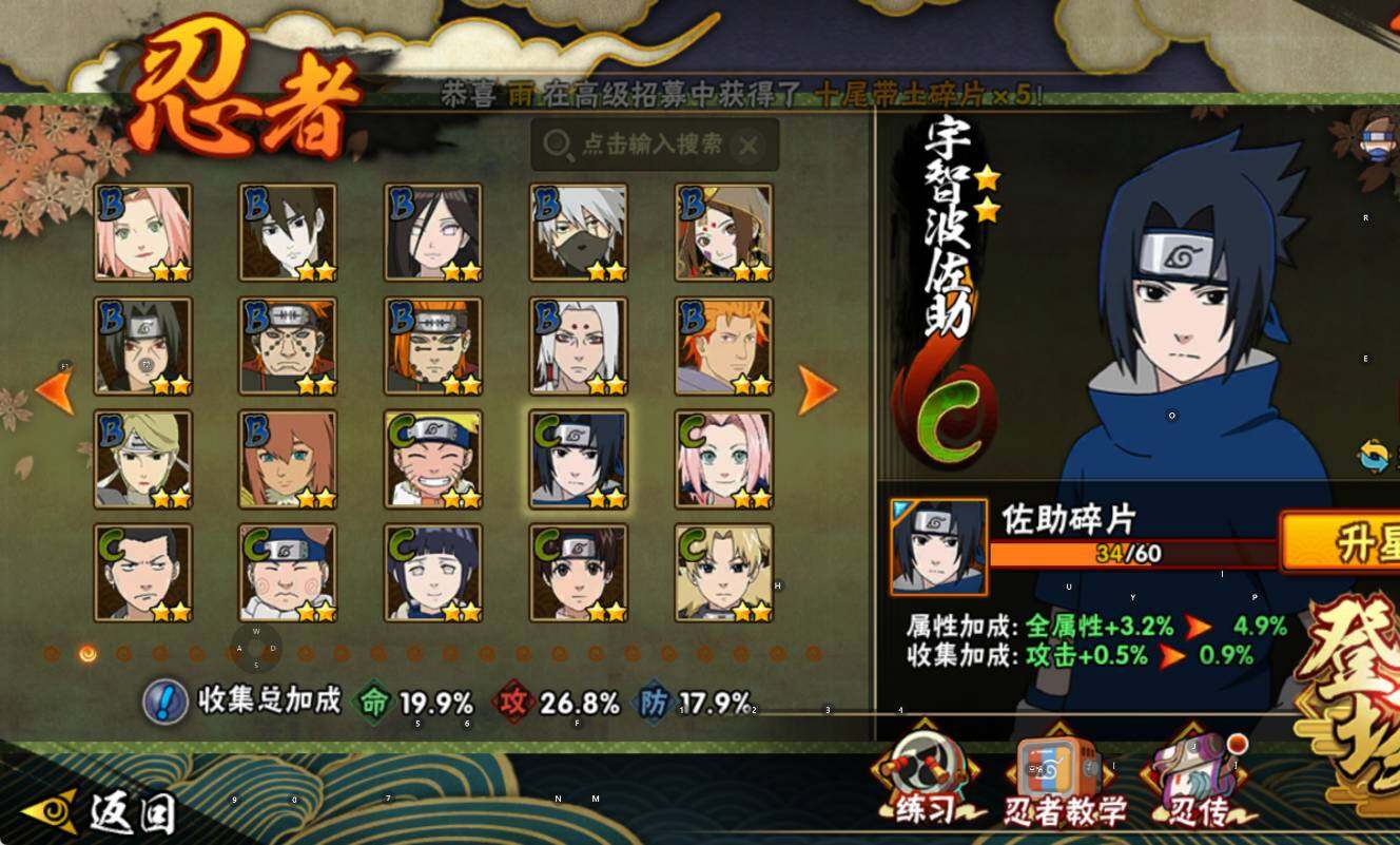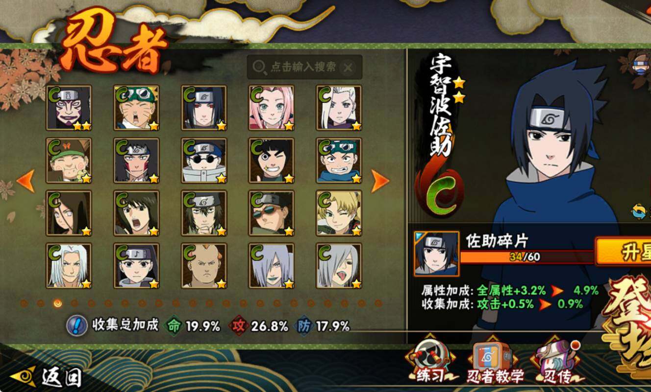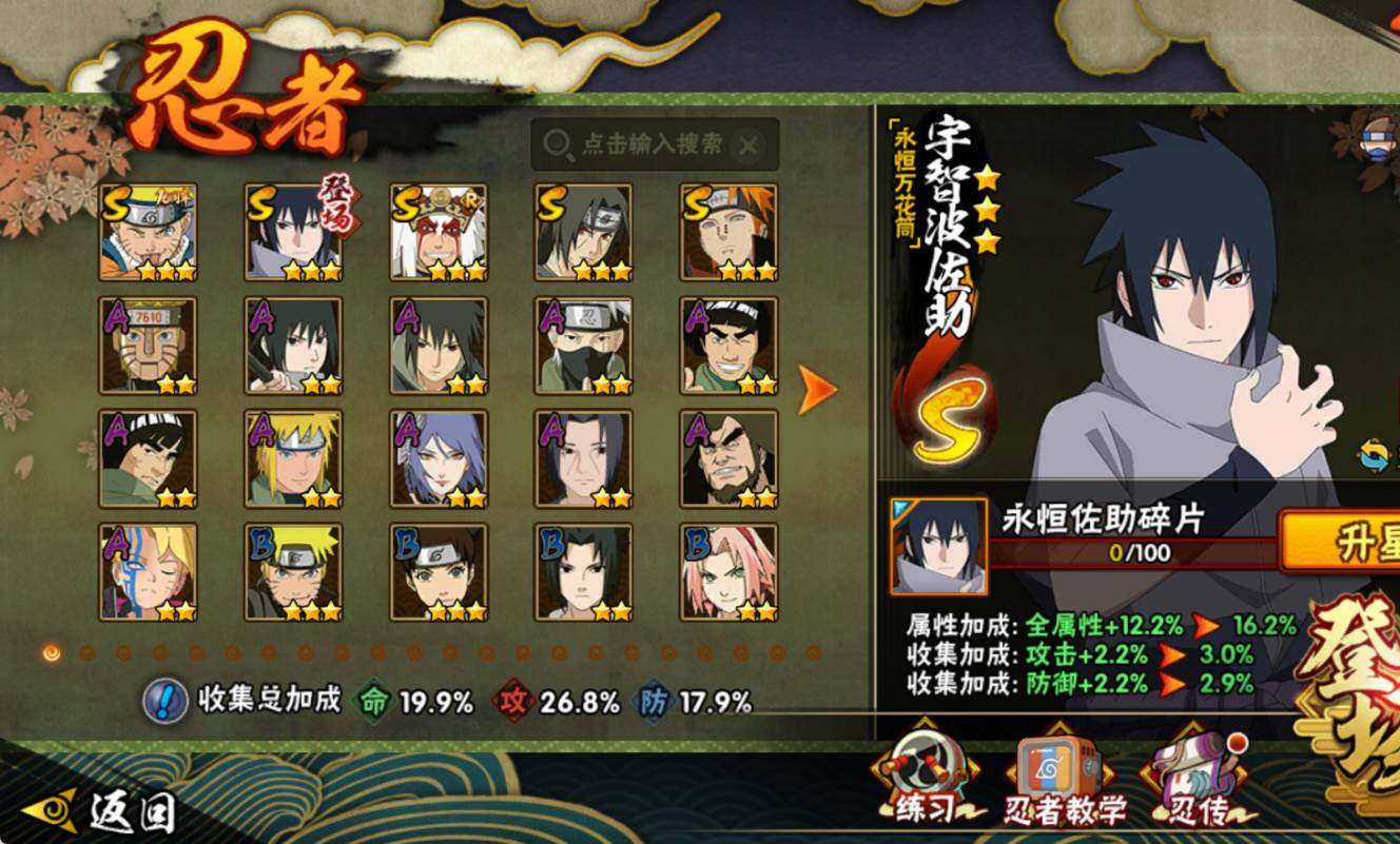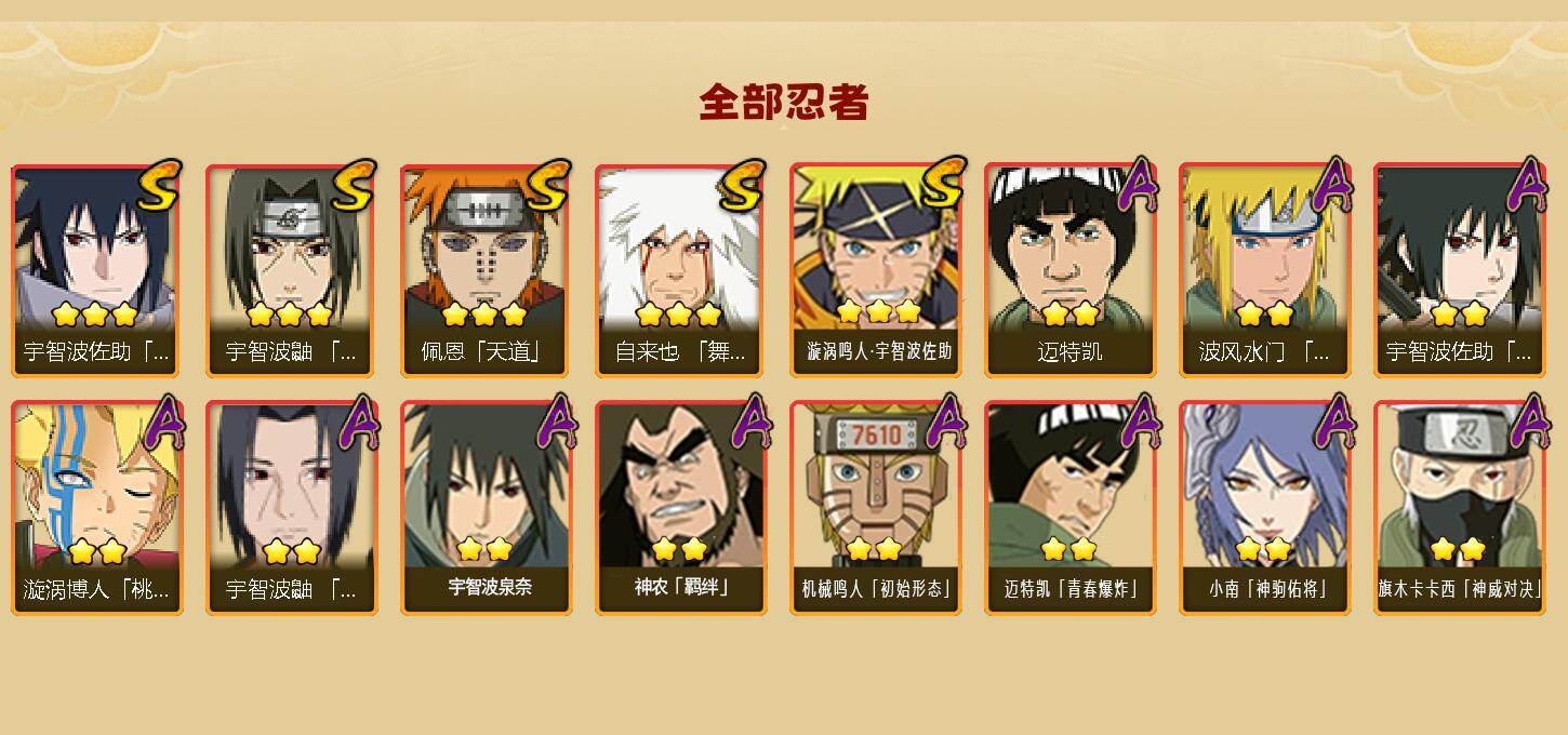 【S级忍者】:宇智波鼬「须佐能乎」(3星),自来也「舞之豪杰」(3星),佩恩「天道」(3星),宇智波佐助「永恒万花筒」(3星),漩涡鸣人·宇智波佐助(3星)