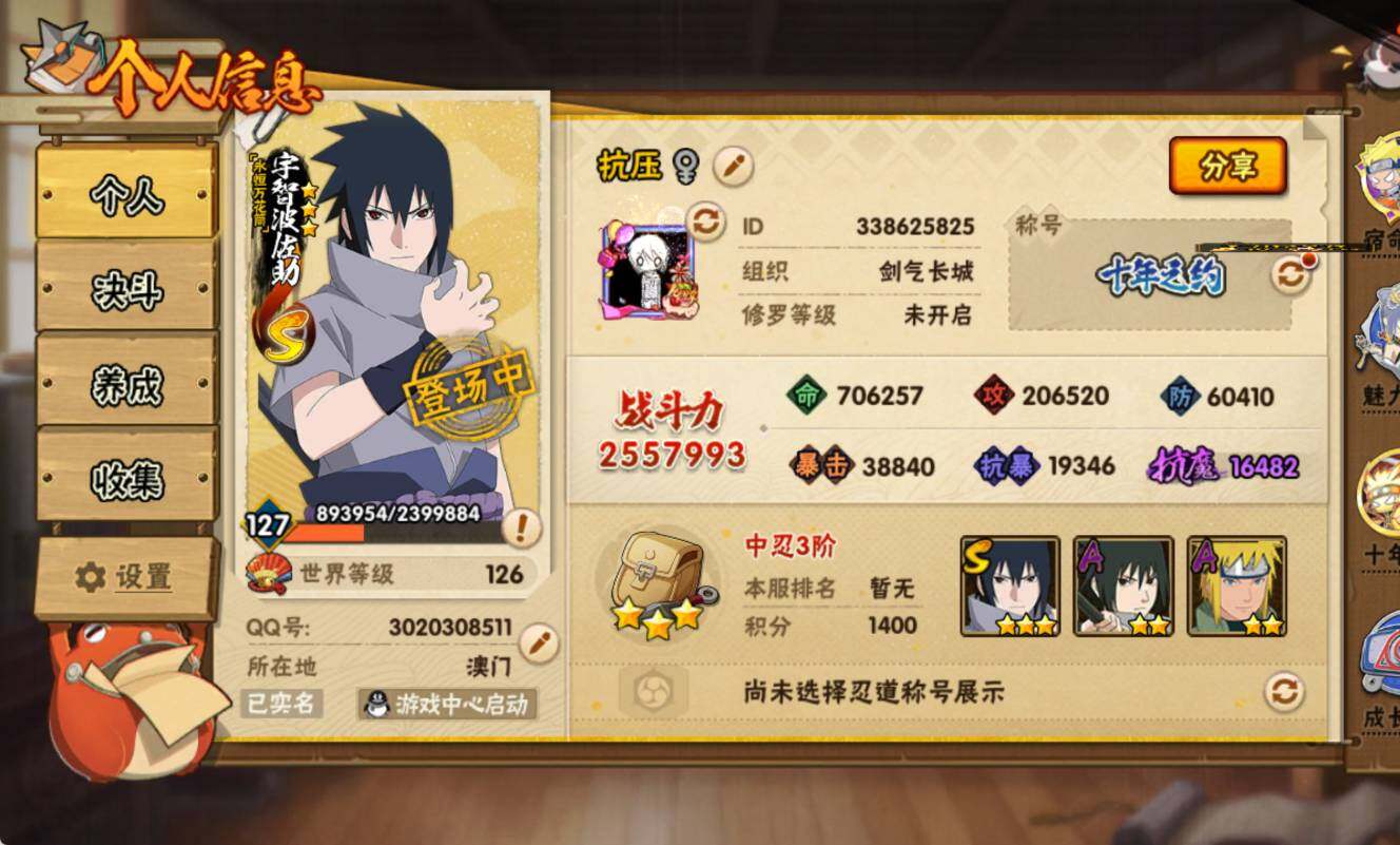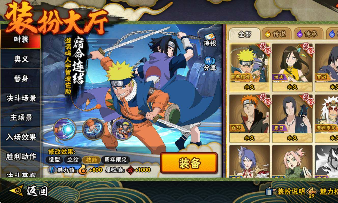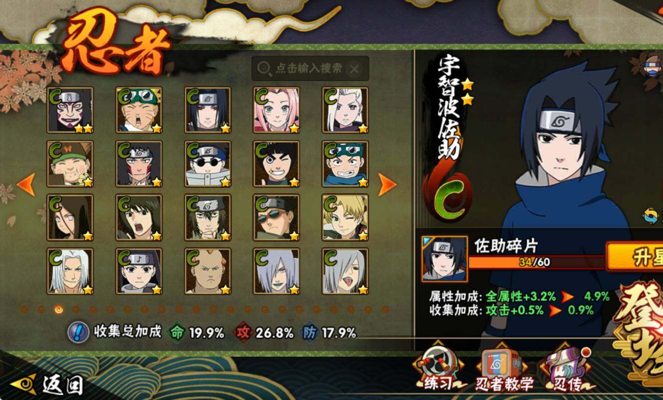 【S级忍者】:宇智波鼬「须佐能乎」(3星),自来也「舞之豪杰」(3星),佩恩「天道」(3星),宇智波佐助「永恒万花筒」(3星),漩涡鸣人·宇智波佐助(3星)