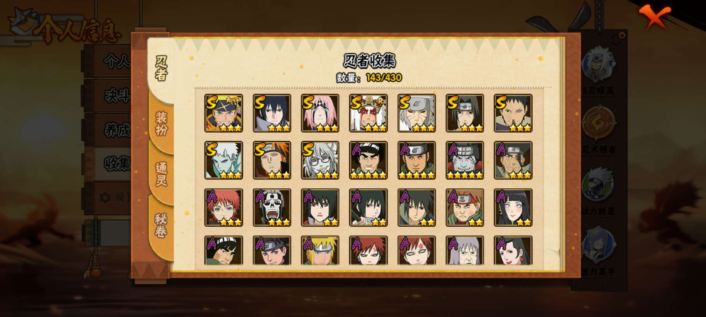 角色等级145 金币3717 战斗力7670244 S忍15 A忍29 5 段位上忍
