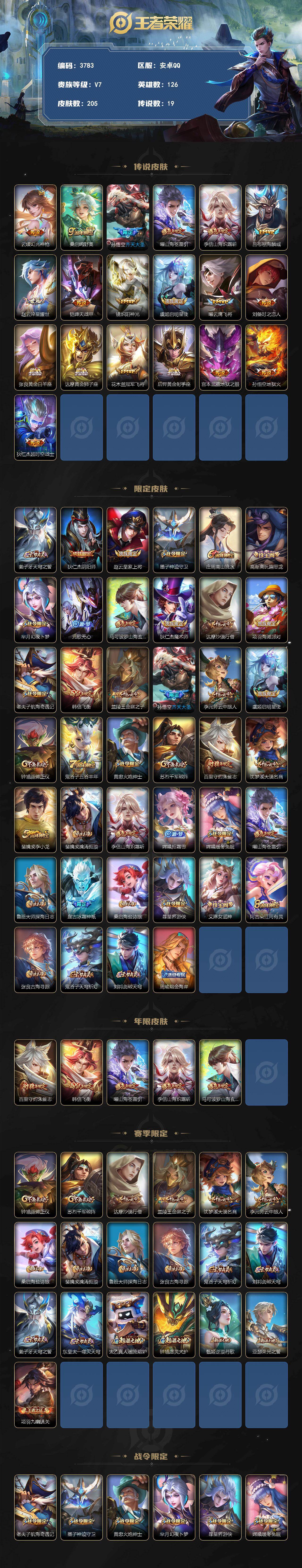 安卓Q-V7-最强王者段位-126英雄-205皮肤-19传说-54史诗