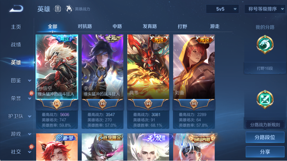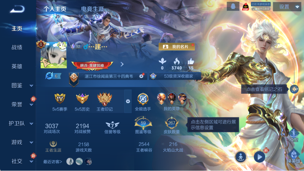 凯+李白无双!韩信典藏!皮肤数量267印记总数5V8至尊星耀