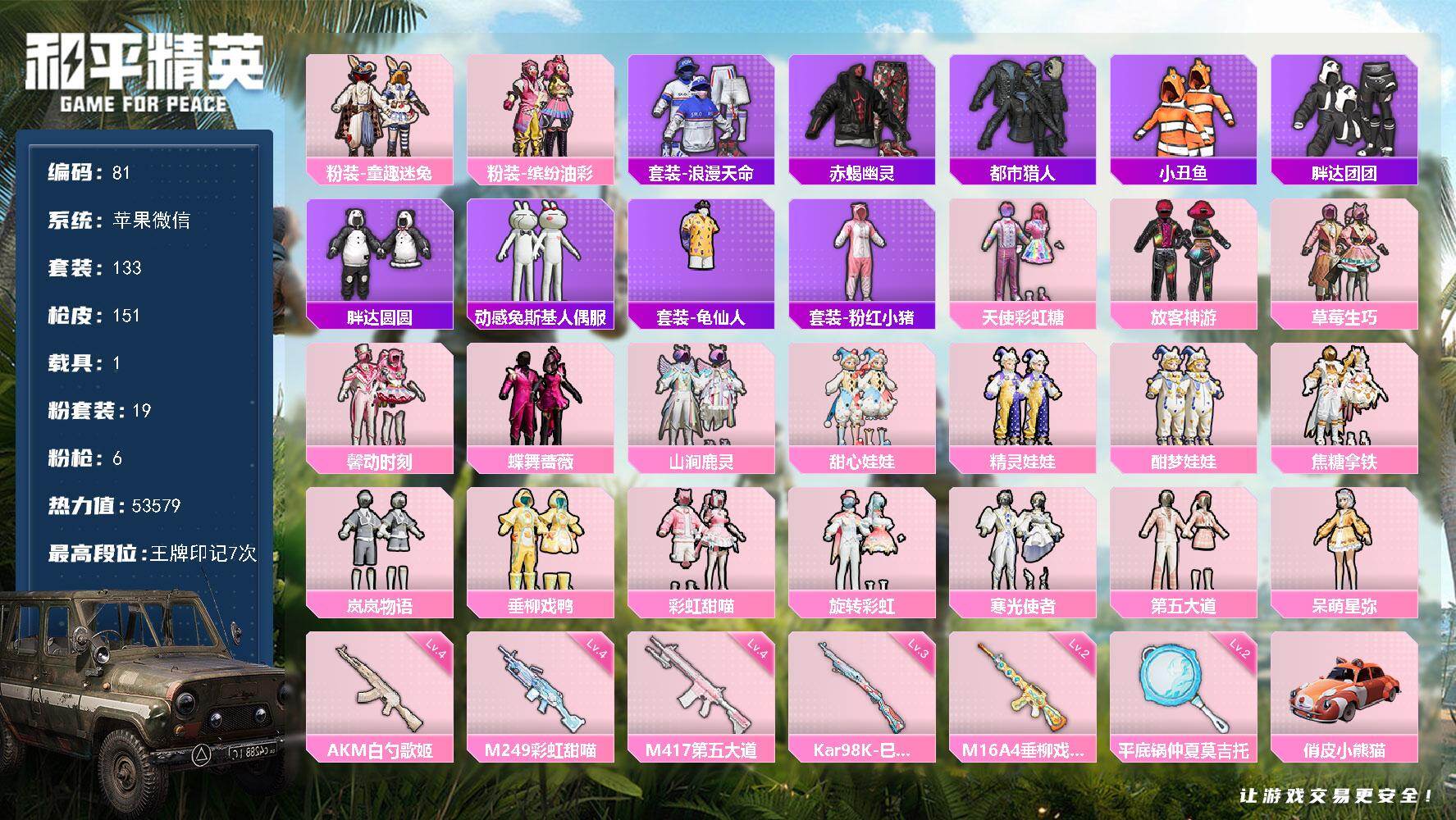 苹果 微信-19粉装-6特效枪-1载具-2粉色飞行器-53579热力值-7王牌印记-133套装-151枪皮