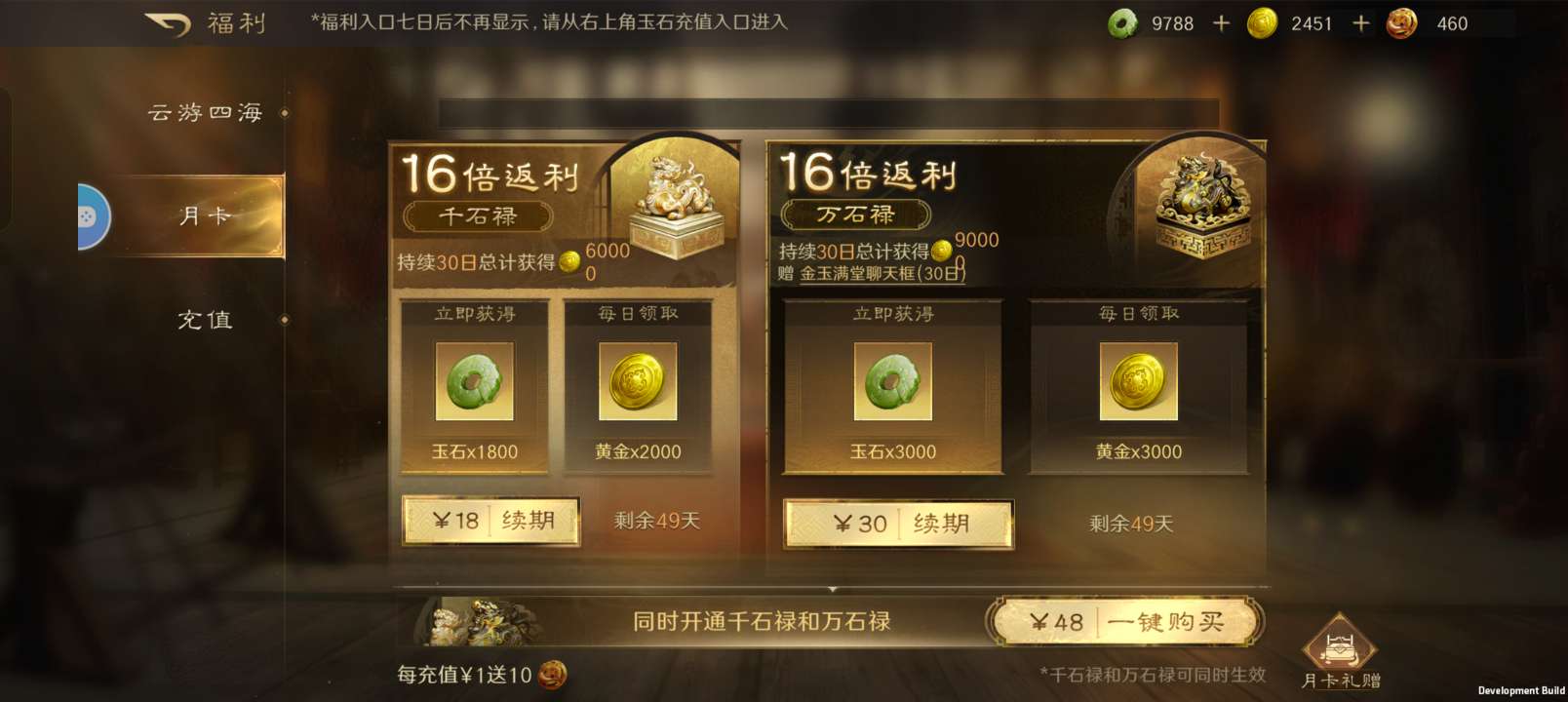 每天可领1w+黄金,现在账号上还有小1w玉石,大月卡+小月卡两个月的