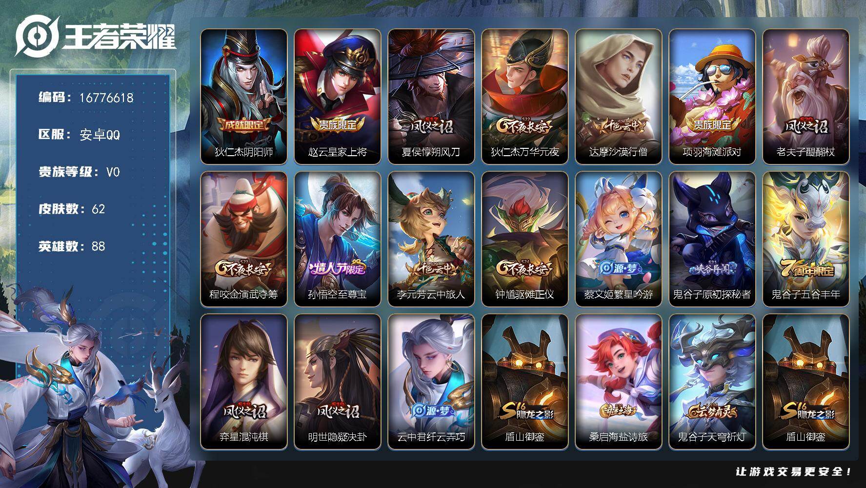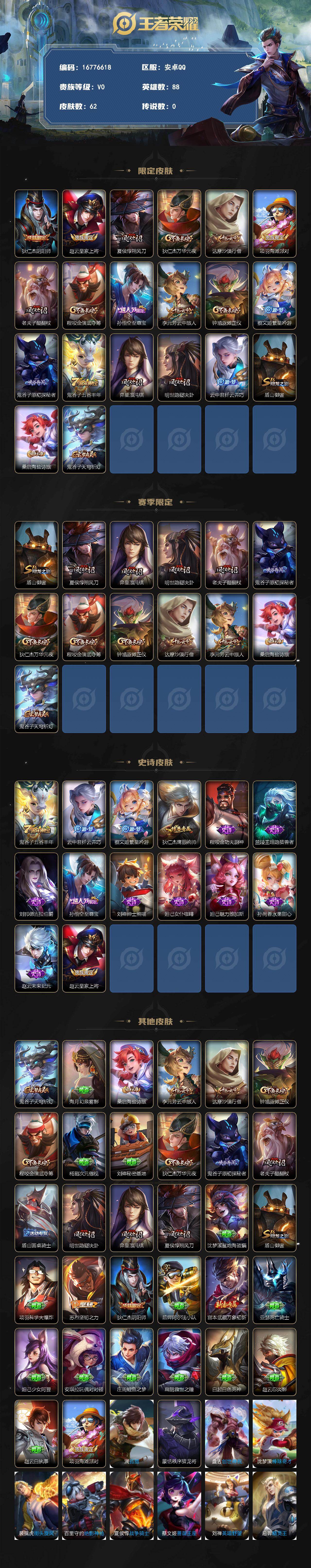 【16776618】安卓Q-V0-荣耀黄金I段位-88英雄-62皮肤-14史诗