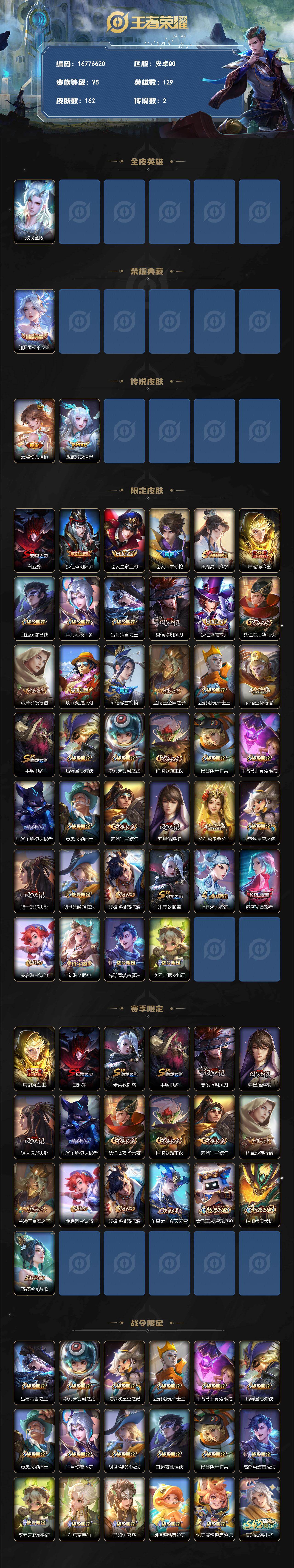 安卓Q-V5-至尊星耀III段位-129英雄-162皮肤-1典藏皮肤-2传说-44史诗