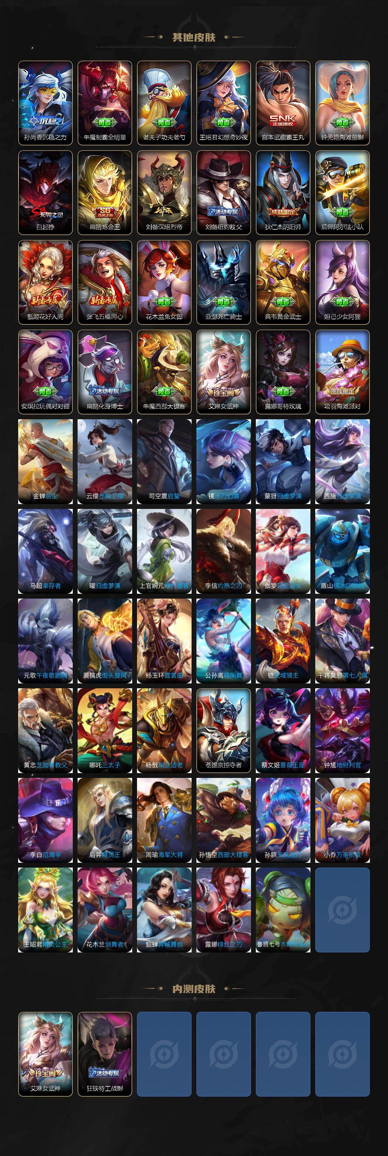 【限定皮肤】:白起狰,狄仁杰阴阳师,赵云皇家上将,赵云百木心枪,庄周高山流水,扁鹊炼金王,白起夜都怪侠,芈月幻夜卜梦,吕布猎兽之王,夏侯惇朔风刀,狄仁杰魔术师,狄
