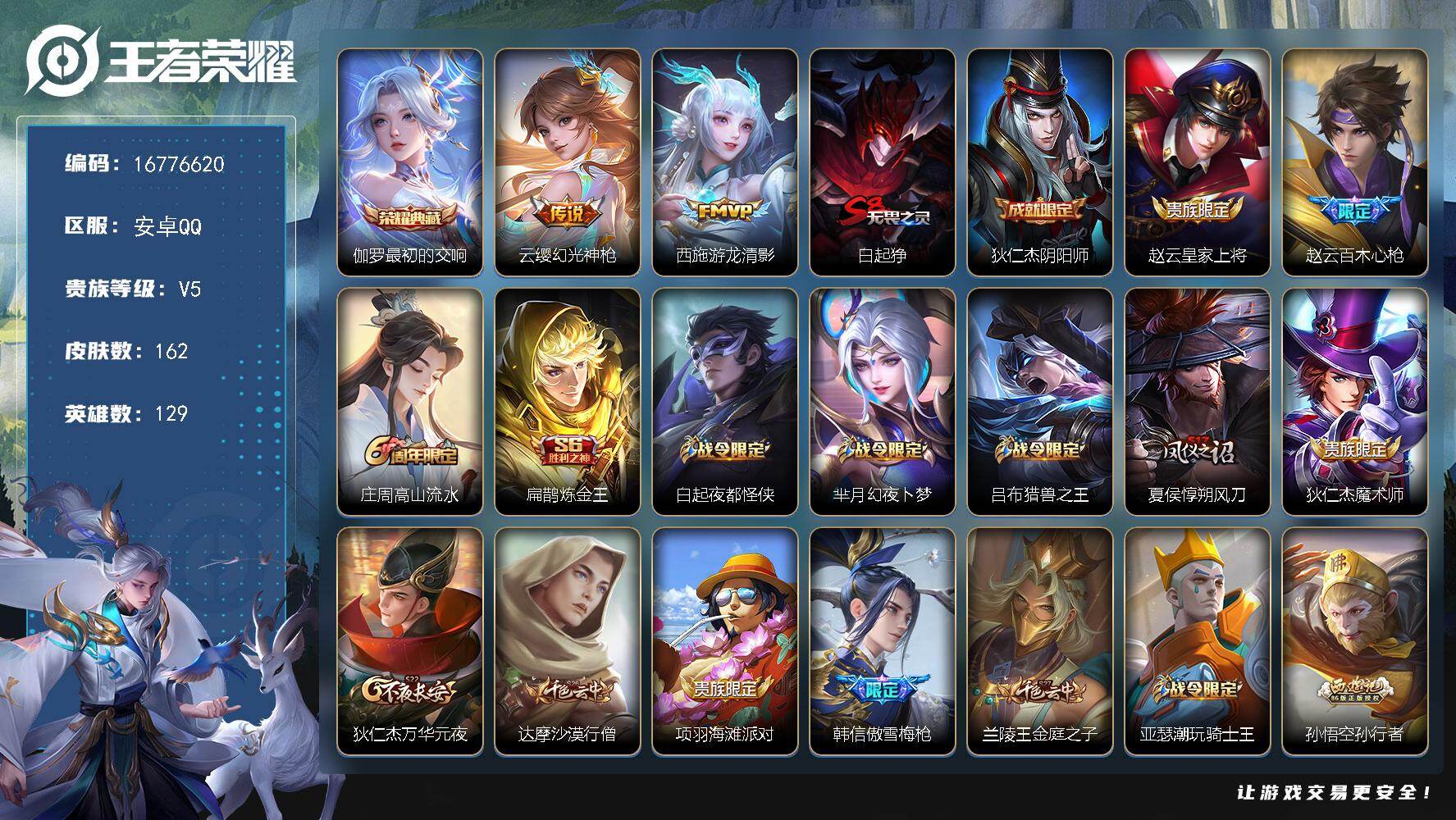 【16776620】安卓Q-V5-至尊星耀III段位-129英雄-162皮肤-