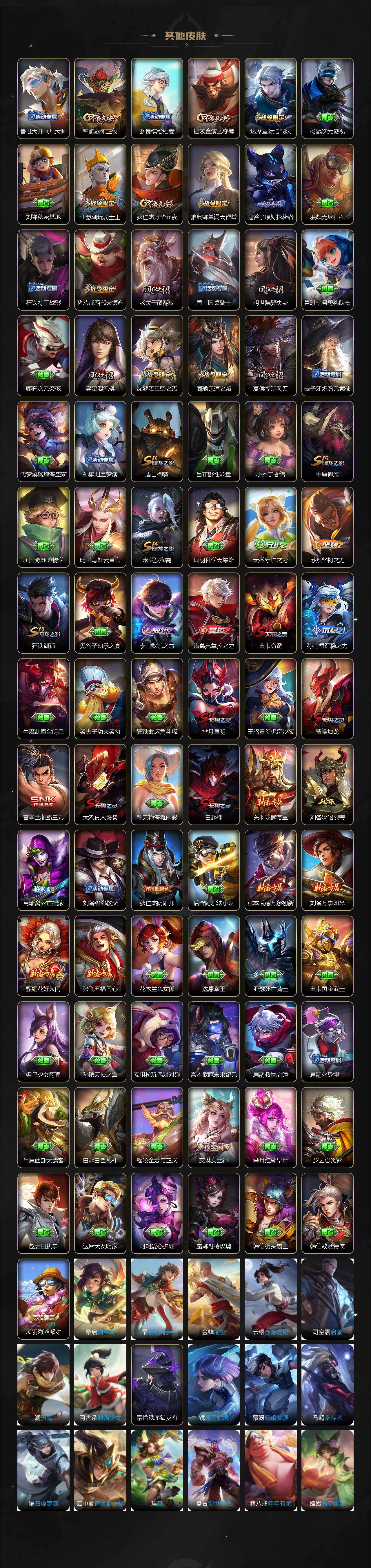 【限定皮肤】:白起狰,暃埋骨钱,姜子牙天穹之誓,狄仁杰阴阳师,赵云皇家上将,孙尚香蔷薇恋人,庄周高山流水,高渐离死亡摇滚,钟无艳超时空战士,扁鹊奇幻