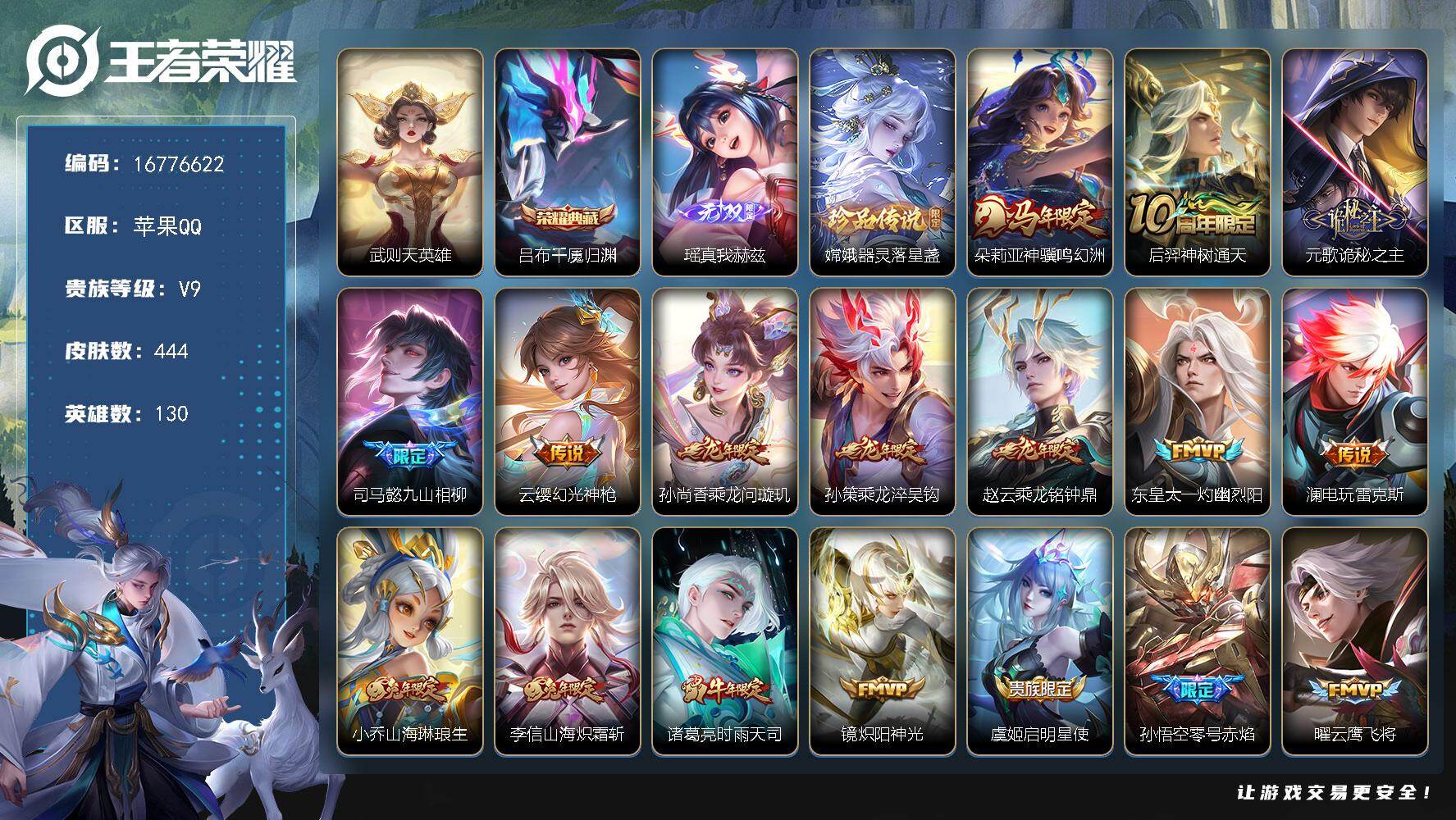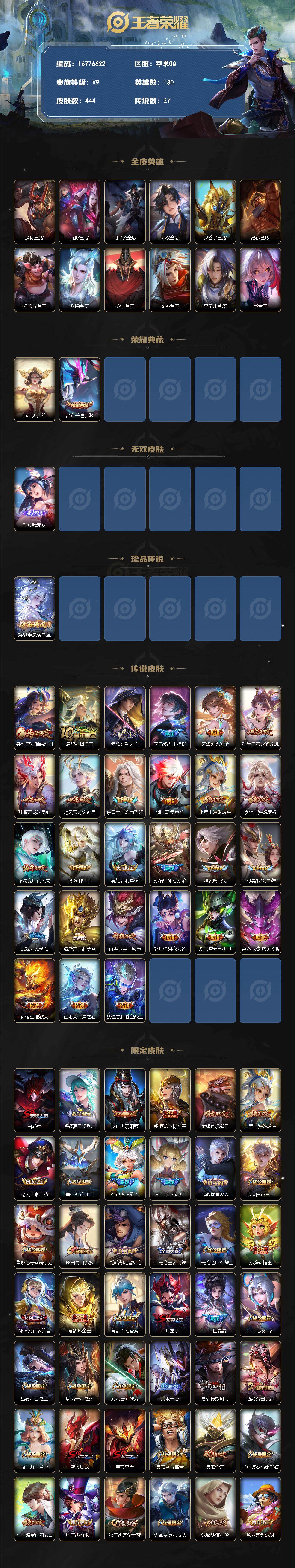 【16776622】苹果Q-V9-至尊星耀IV段位-130英雄-444皮肤-1典藏皮肤-1典藏英雄-1无双-1珍品传说-27传说-139史诗