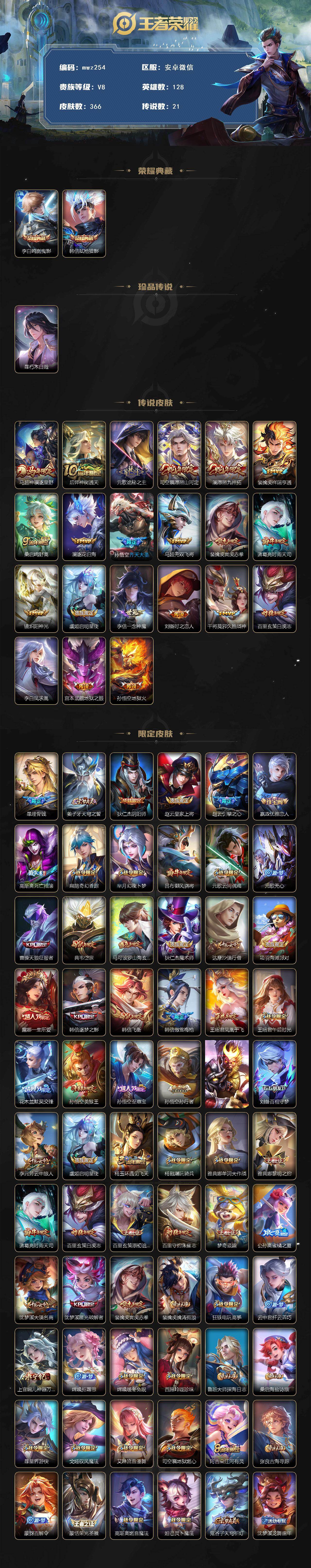 【mwz254】安卓WX-V8-最强王者段位-128英雄-366皮肤-2典藏皮肤-1珍品传说-21传说-114史诗