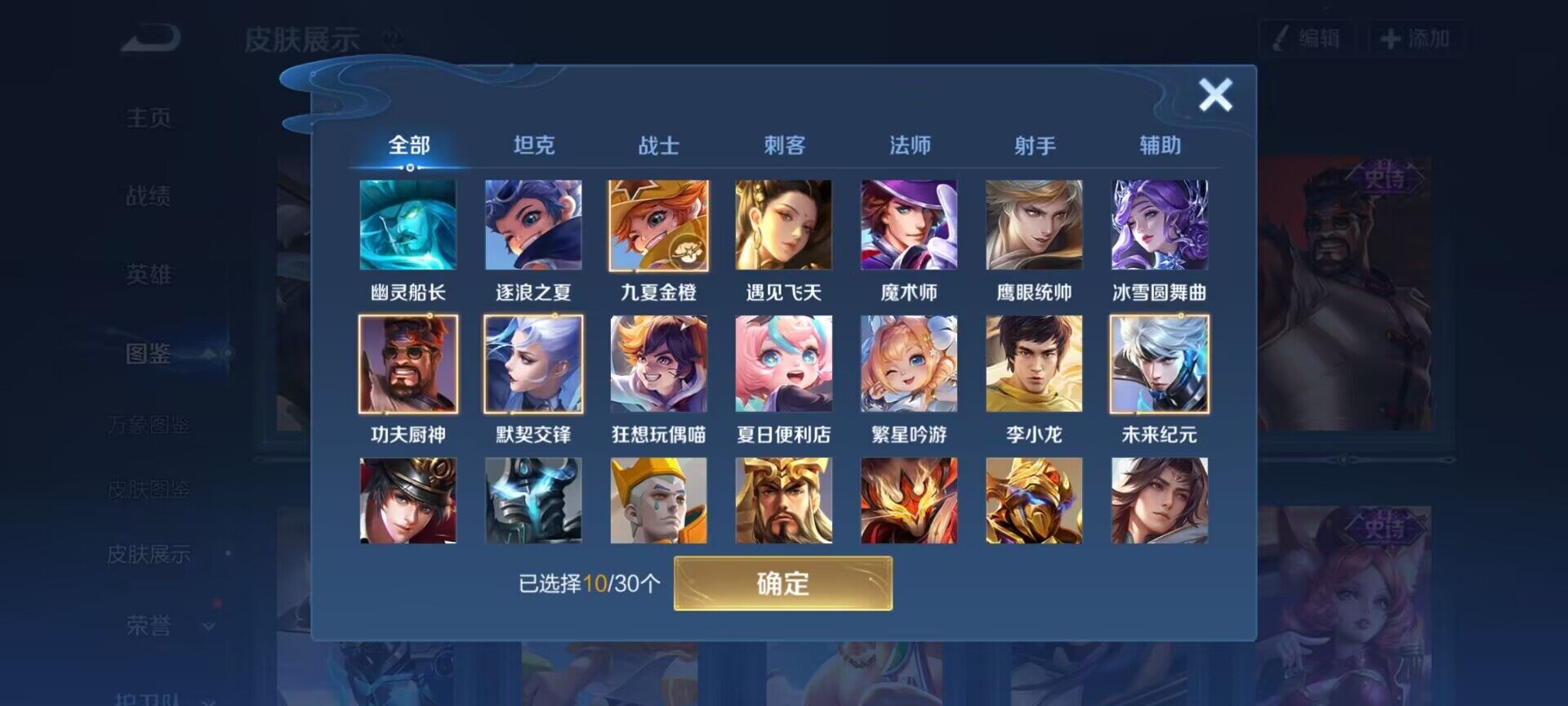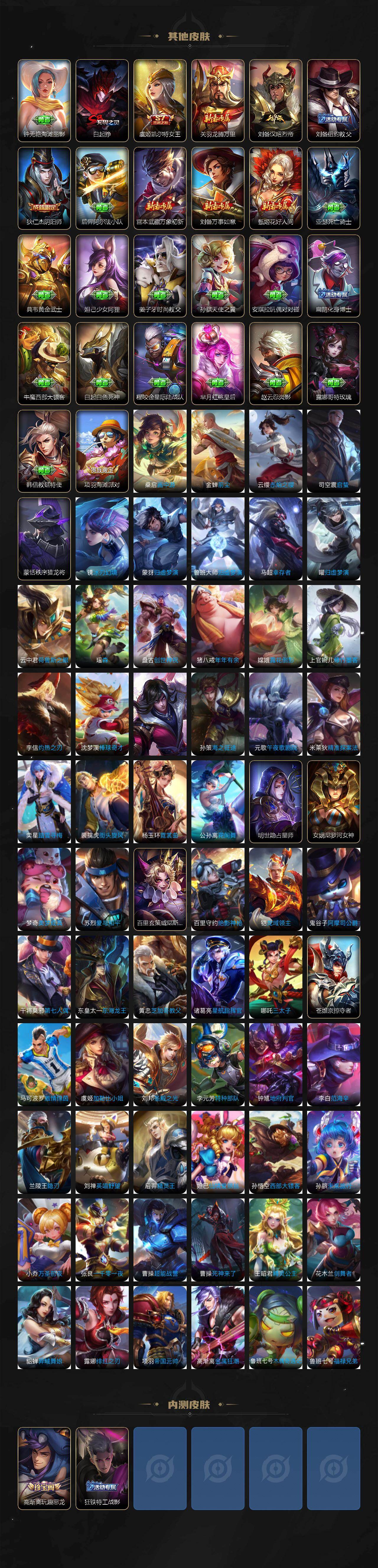 【限定皮肤】:白起狰,蔡文姬夏日便利店,大乔绒语心约,虞姬夏日便利店,姜子牙天穹之誓,狄仁杰阴阳师,虞姬凯尔特女王,赵云皇家上将,墨子神迹守卫,高渐离玩趣恶龙,扁鹊奇幻香踪,芈月重明,吕布御风骁将,周瑜赤莲之焰,元歌云间偶戏,夏侯惇朔风刀,曹操烛