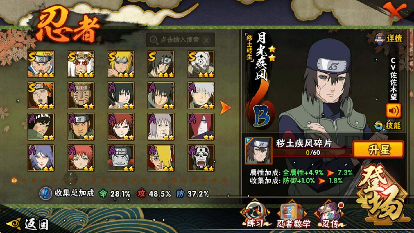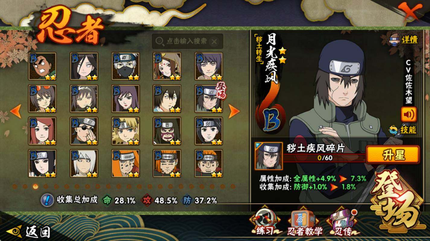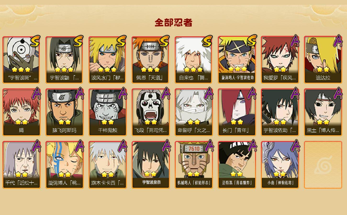 【S级忍者】:波风水门「秽土转生」(3星),宇智波鼬「须佐能乎」(3星),自来也「舞之豪杰」(3星),佩恩「天道」(3星),宇智波斑 「白面具」(3星宇智波斑「白面具」),漩涡鸣人·宇智波佐助(3星)