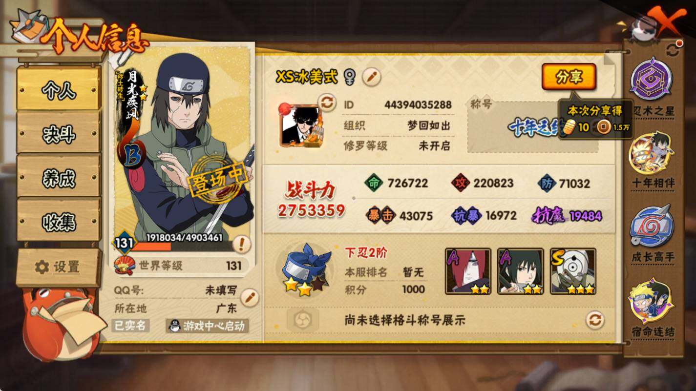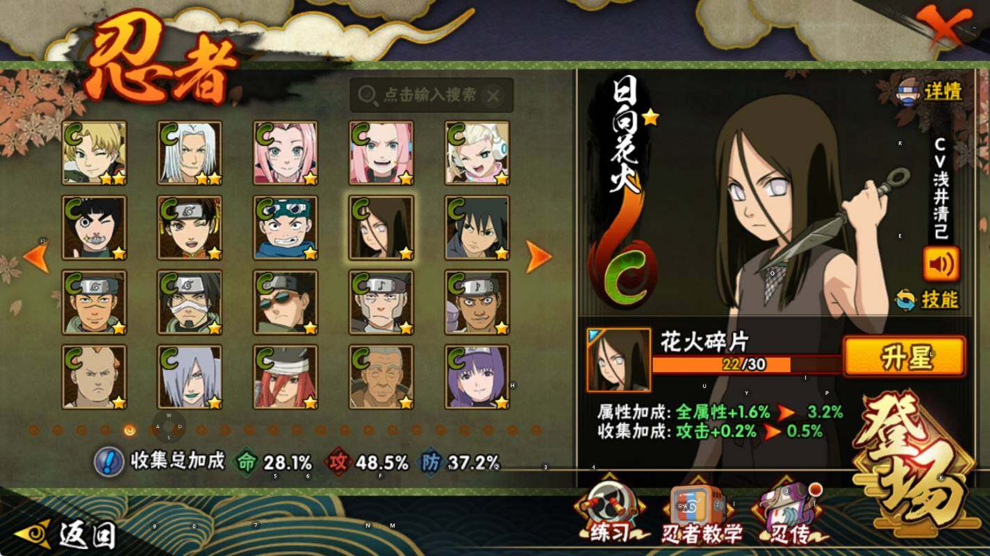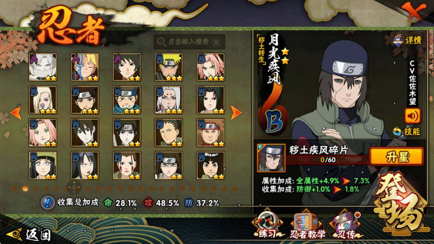 【S级忍者】:波风水门「秽土转生」(3星),宇智波鼬「须佐能乎」(3星),自来也「舞之豪杰」(3星),佩恩「天道」(3星),宇智波斑 「白面具」(3星宇智波斑「白面具」),漩涡鸣人·宇智波佐助(3星)