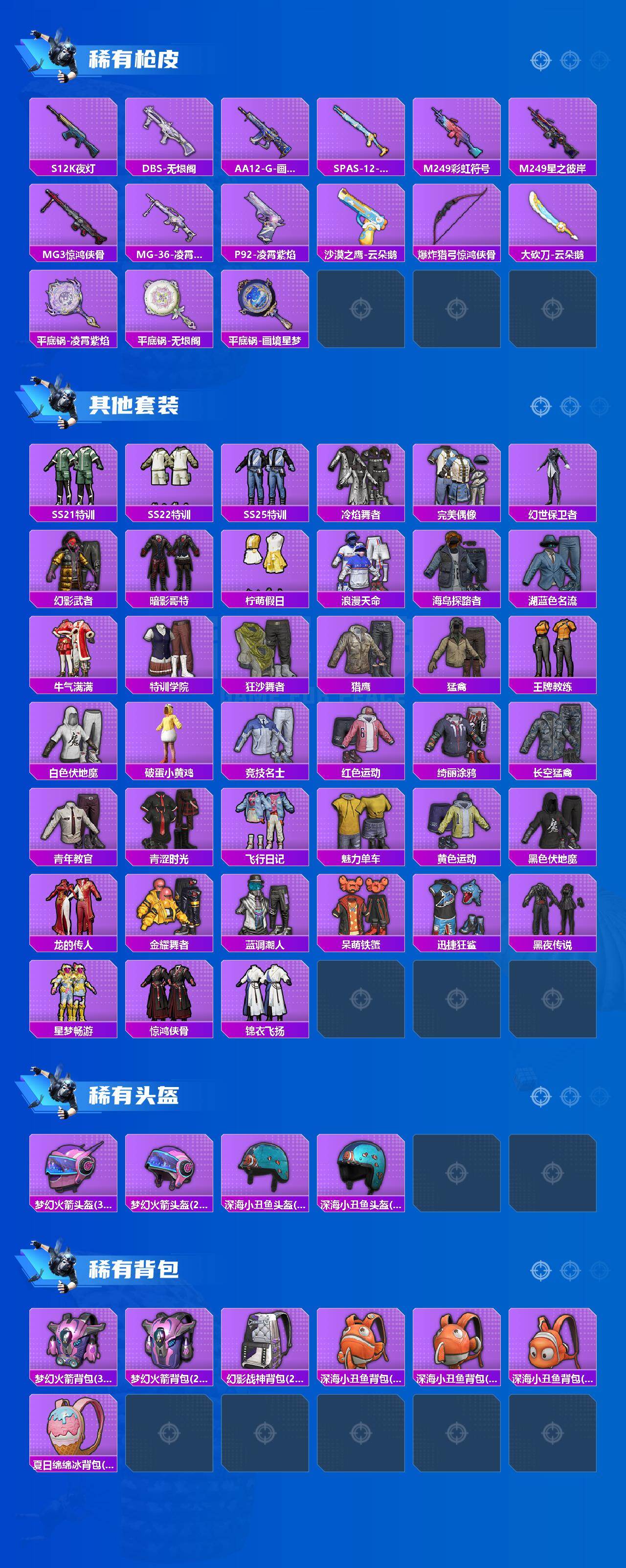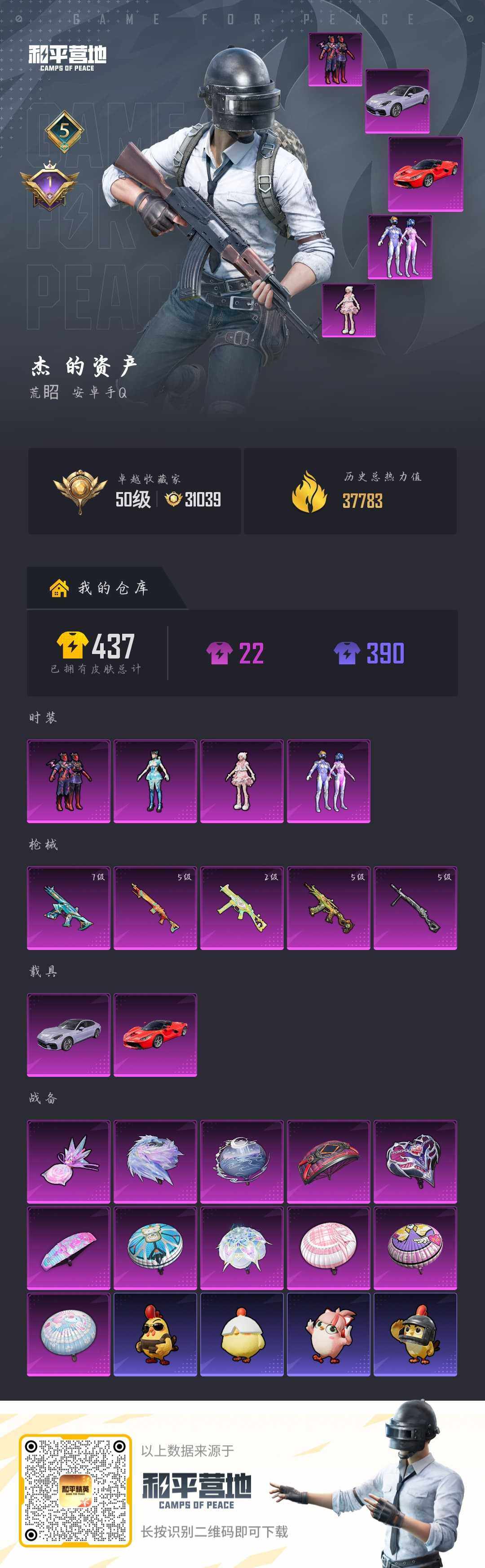 精氪号 安卓 手Q-4粉装-5特效枪-2载具-1粉色飞行器-37783热力值-5王牌印记-82套装-125枪【热门品类】:粉装-梦幻火箭,套装-浪漫天命,套装-小丑鱼,套装-暗影哥特【粉色套装】:粉装-梦幻火箭,粉装-星之彼岸,角色-羊梦糖心,角色-异瞳寒姬【粉色枪皮等级】:蜜獾-异瞳寒姬(七级),UMP45-萌骑冒险(二级),AKS-74U-森灵之息(五级),Mk14-福马献瑞(五级),DP-28-豹影疾电(五级)【粉色载具】:法拉利LaFerrari(赛车红),保时捷Panamera(星辰紫