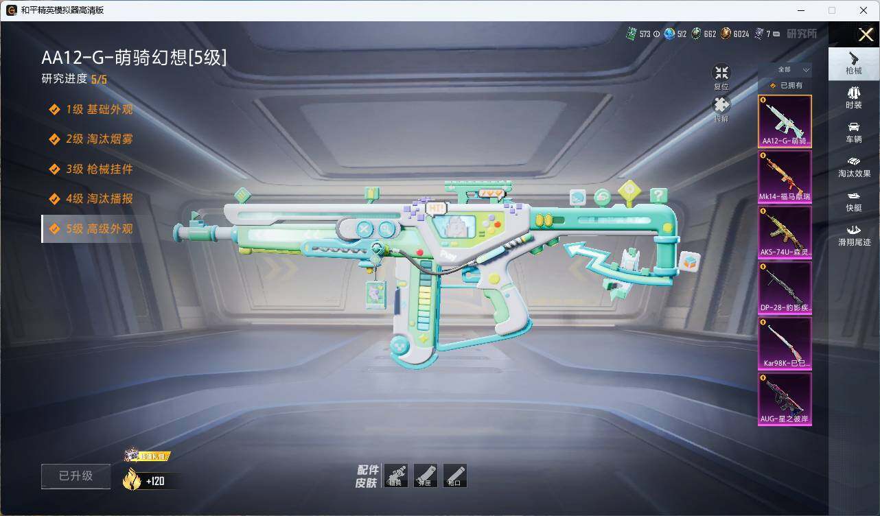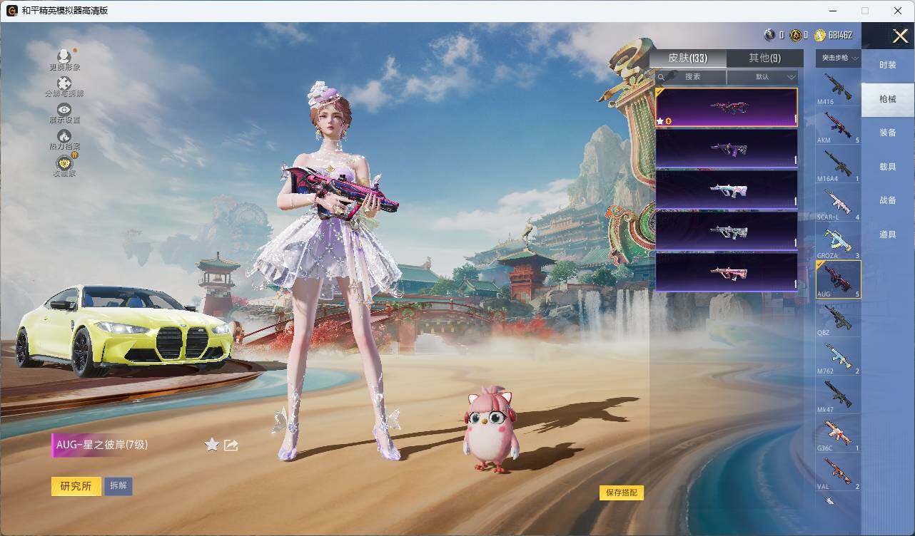 【粉色枪皮等级】:AUG-星之彼岸(七级),AKS-74U-森灵之息(五级),Kar98K-巳巳如意(五级),M