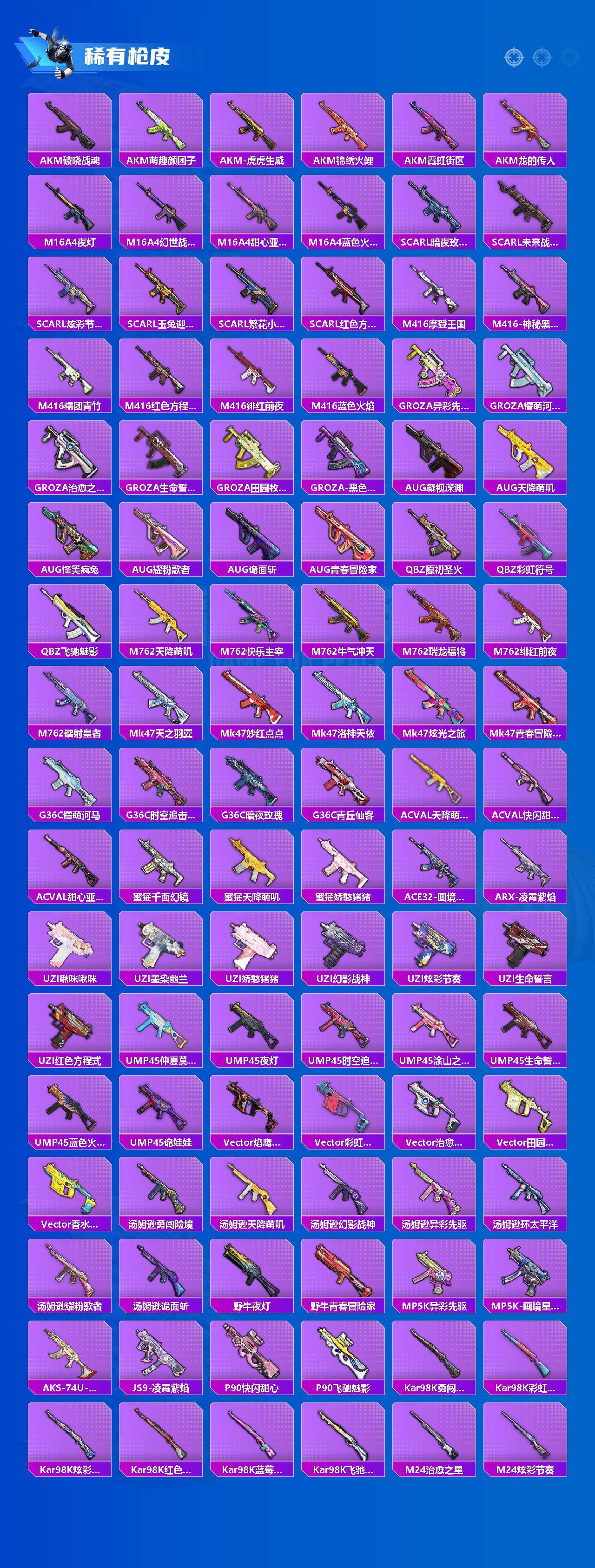 【粉色枪皮等级】:AKM-梦之光华(七级),M416-五爪金龙(六级),M762-冷魅冰骑(五级),UMP45-量子极限(五级),Kar98K-