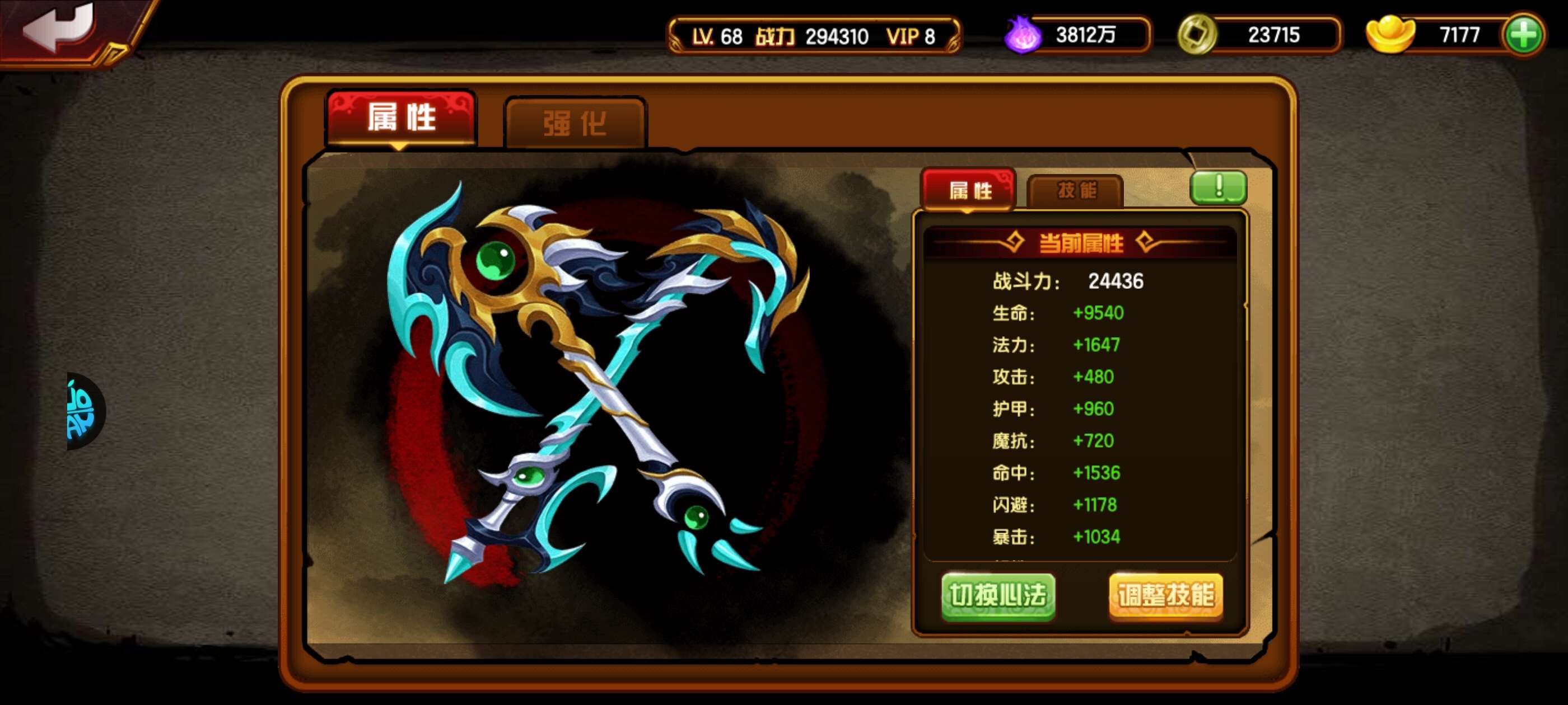 68级心法常4丹蛇宠加圈子,差把武器二学一星通天7k元宝