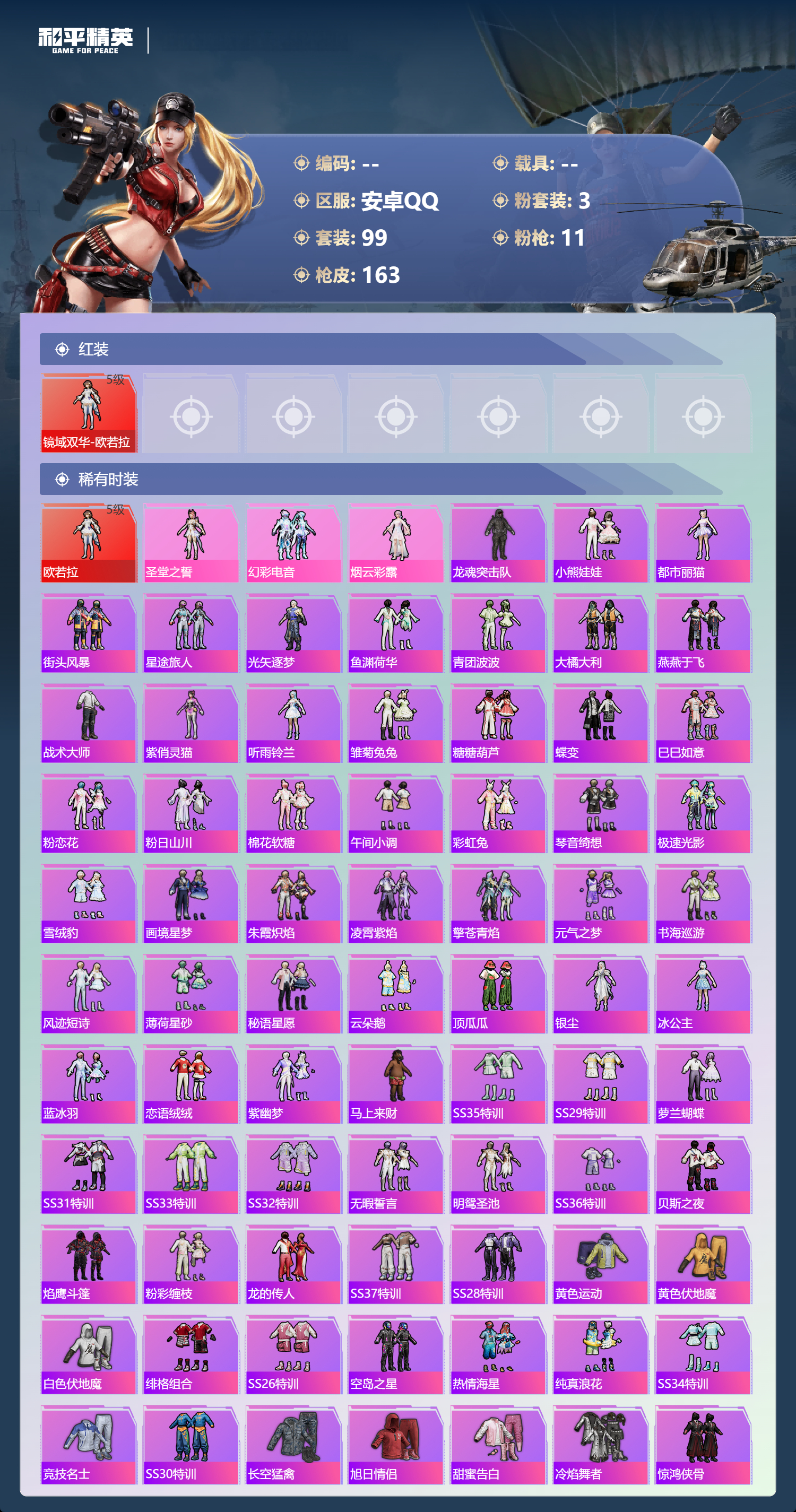hs67806 安卓手Q-12王牌印记-1红装-3粉装-11特效枪-57250热力值-99套装-163枪皮-3卓越印记-1传奇印记