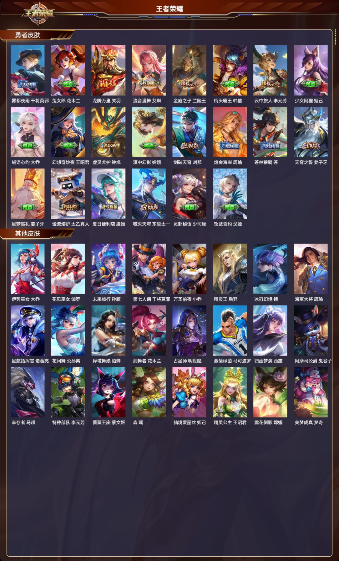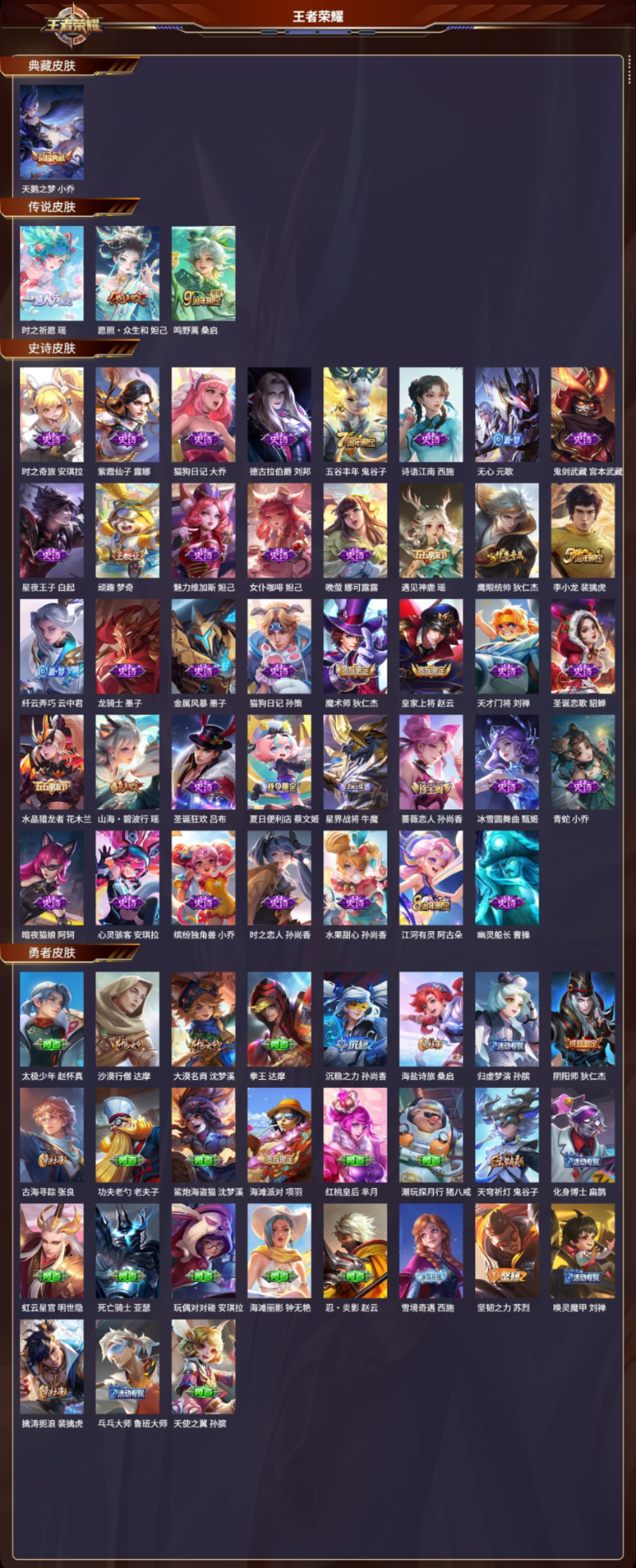 【39 史诗皮肤】时之奇旅 安琪拉,紫霞仙子 露娜,猫狗日记 大乔,德古拉伯爵 刘邦,五谷丰年 鬼谷子,诗语江南 西施,无心 元歌,鬼剑武藏 宫本武藏,星夜王子