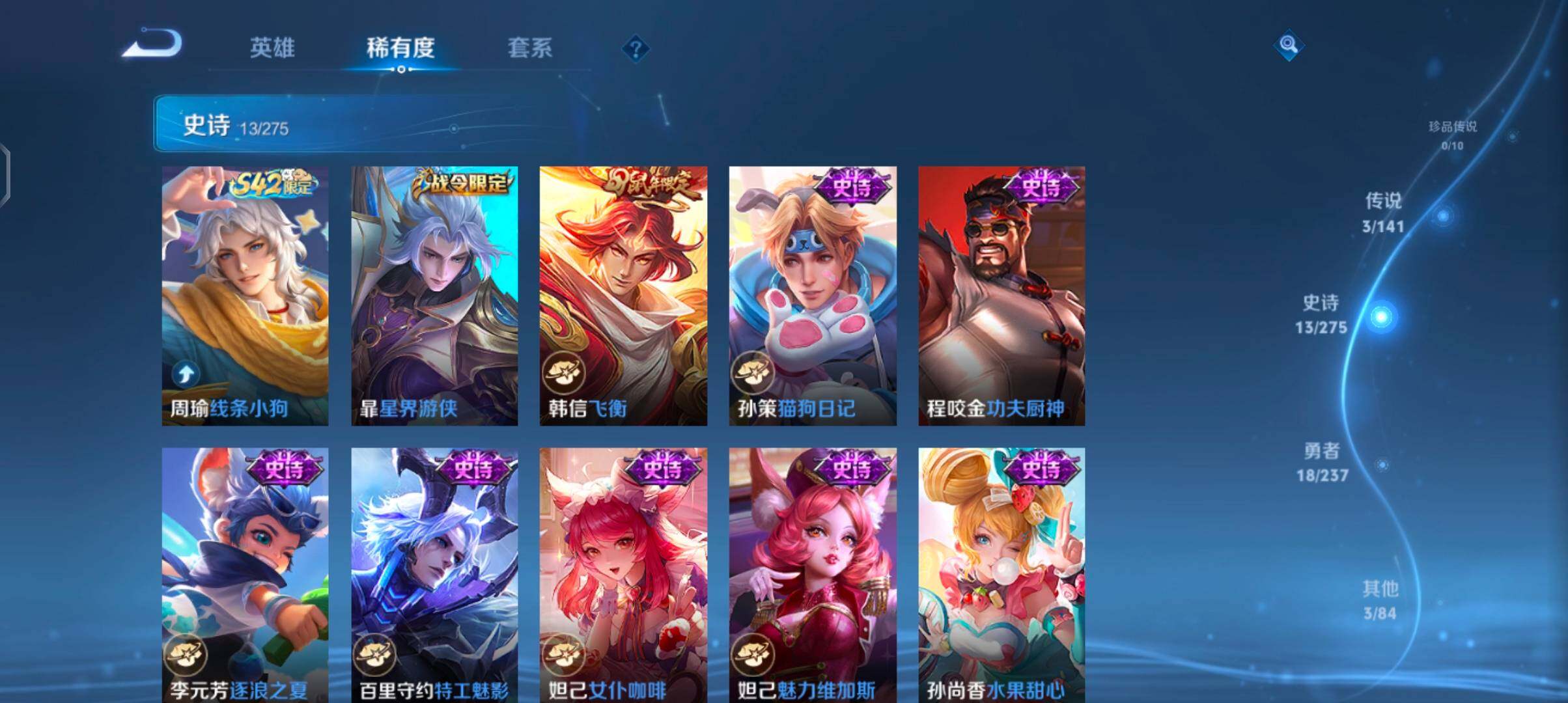 【限定皮肤】:狄仁杰阴阳师,赵云皇家上将,狄仁杰魔术师,项羽海滩派对,韩信飞衡,孙悟空齐天大圣,李元芳云中旅人,嫦娥暖冬兔眠,桑启海盐诗旅,暃星界游侠