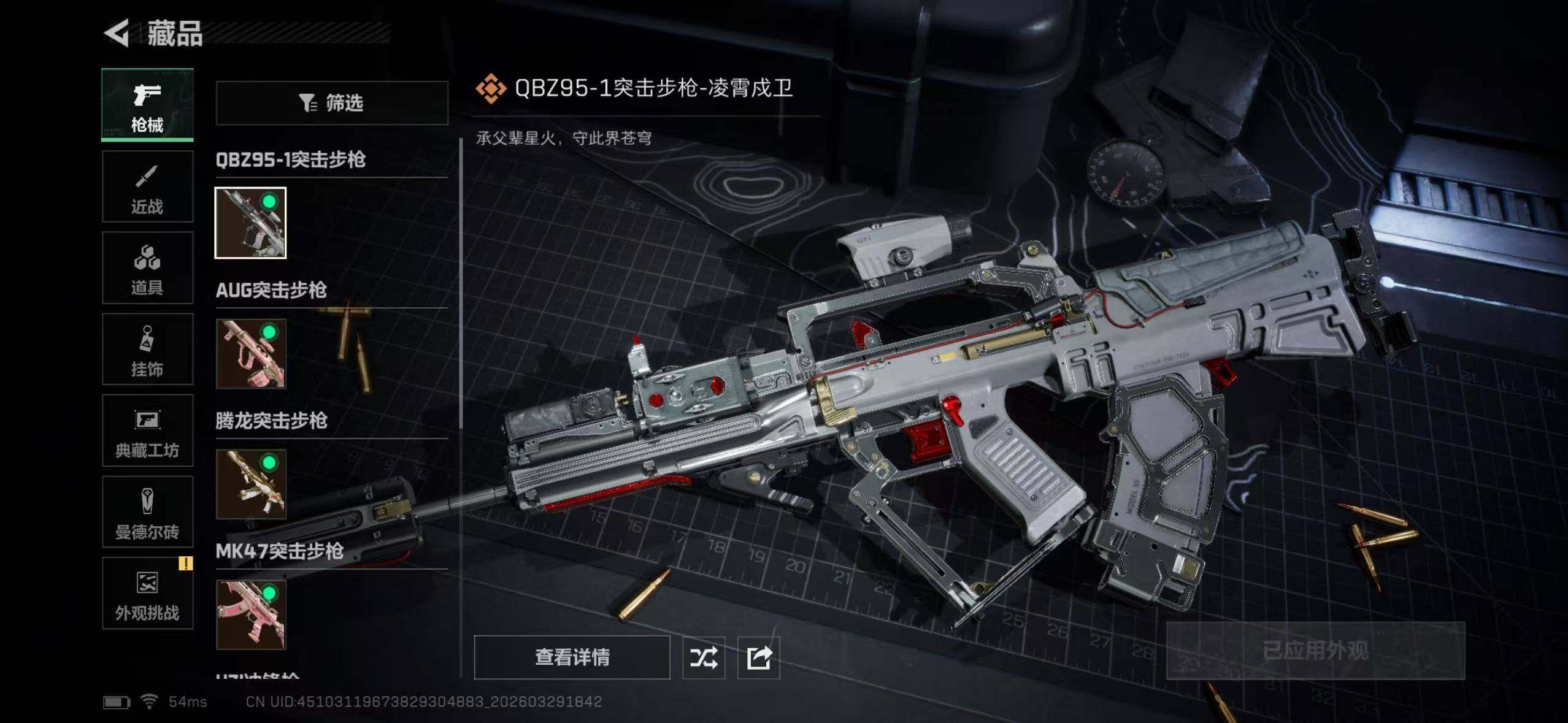 【传说外观】:QBZ95-1突击步枪-凌霄戍卫,AUG突击步枪-悠然茶歇,腾龙突击步枪-万金泪冠,MK47突击步枪-悠然茶歇,UZI冲锋枪-悠然茶歇,勇士冲锋枪-万金泪冠,QCQ171冲锋枪-不羁人生,AWM狙击步枪-万金泪冠