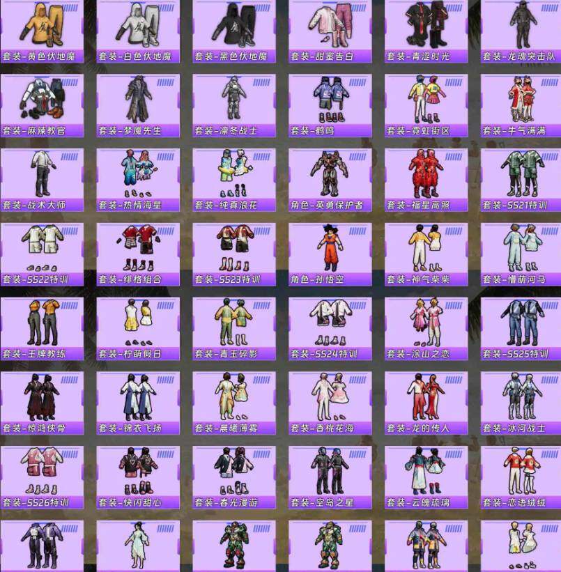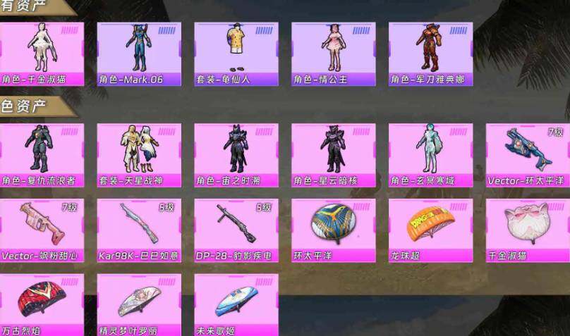 【粉色套装】:角色-复仇流浪者,粉装-天星战神,角色-宙之时溯,角色-星云暗核,角色-千金淑猫,角色-玄冥寒域