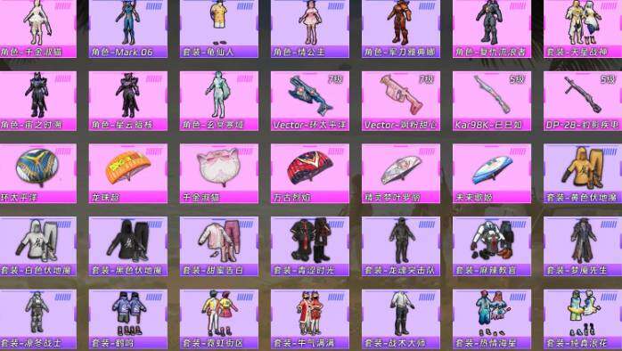 【粉色枪皮等级】:Vector-环太平洋(七级),Vector-飒粉甜心(七级),Kar98K-巳巳如意(五级),DP-28-豹影疾电(五级)