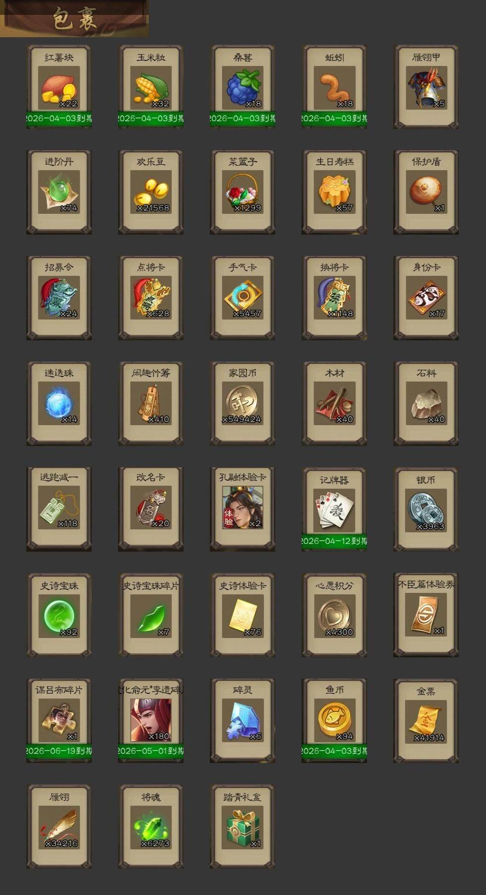官阶:大将军;VIP等级:VIP11;史诗武将数量:63;动态皮肤数量:62;武将总数:430;史诗宝珠数量:92;将魂数量:6273;神将:10;魏国史诗武将:23;蜀国史诗武将:12;吴国史诗武将:8;群史诗武将:19