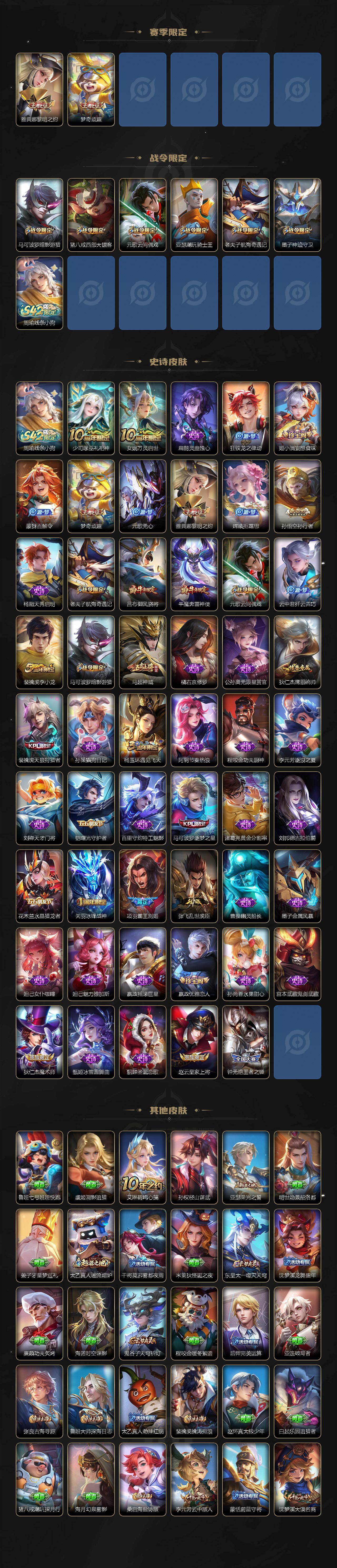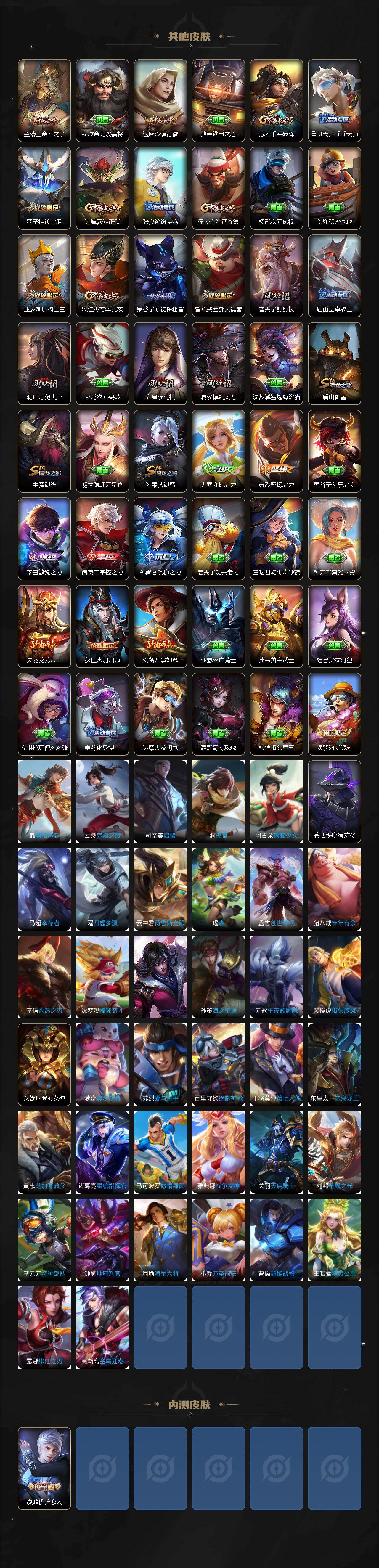【传说皮肤】:后羿神树通天,桑启鸣野蒿,露娜霜月吟,李白诗剑行,兰陵王默契交锋,孙悟空零号赤焰,关羽武圣,曜云鹰飞将,达摩黄金狮子座,百里玄策白虎志