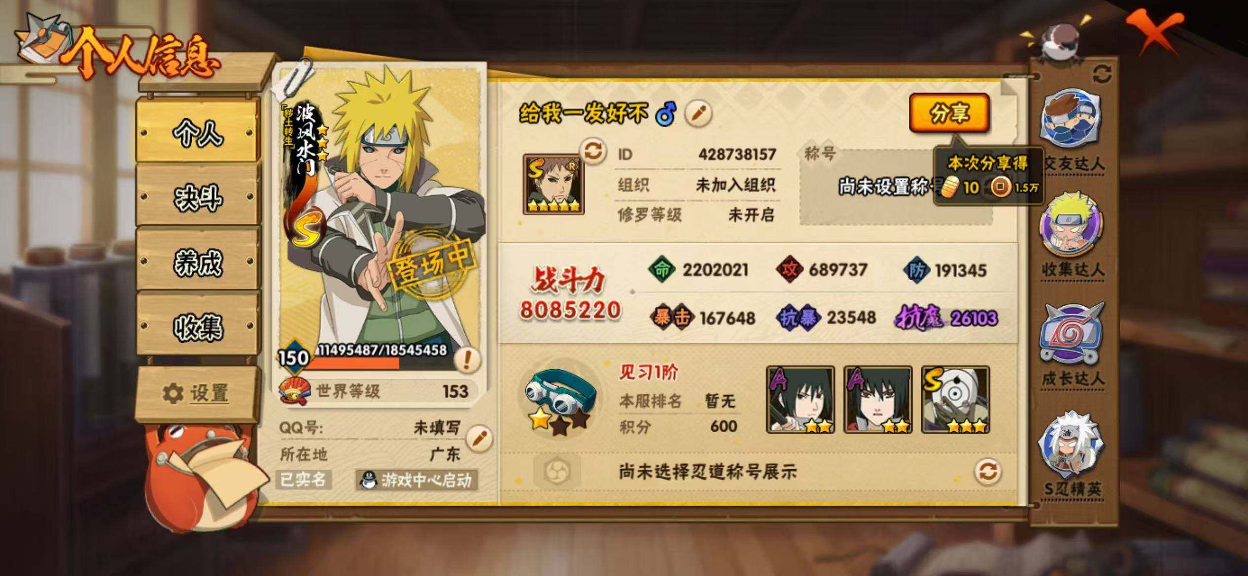 【HYN5435】V8/战力808W/S忍16/A忍30/通灵兽18/秽土转生-宇智波斑/百豪-纲手/忍界大战-日向宁次/宇智波鼬/宇智波止水/5星猿飞阿斯玛/秽土转生-猿飞日斩/天道-佩恩/4星蝎/五代目水影-照美冥/千手扉间/秽土转生-波风水门/忍界大战-秋道丁次/4星波风水门/5星迈特凯/万花筒写轮眼-旗木卡卡西/3星我爱罗「疾风传」/仙人模式-药师兜/青年-波风水门/舞之豪杰-自来也/百豪-春野樱/白面具-宇智波斑/千手柱间/4星飞段/秽土转生-迪达拉/半蛇斗篷-药师兜/奇拉比/3星飞段