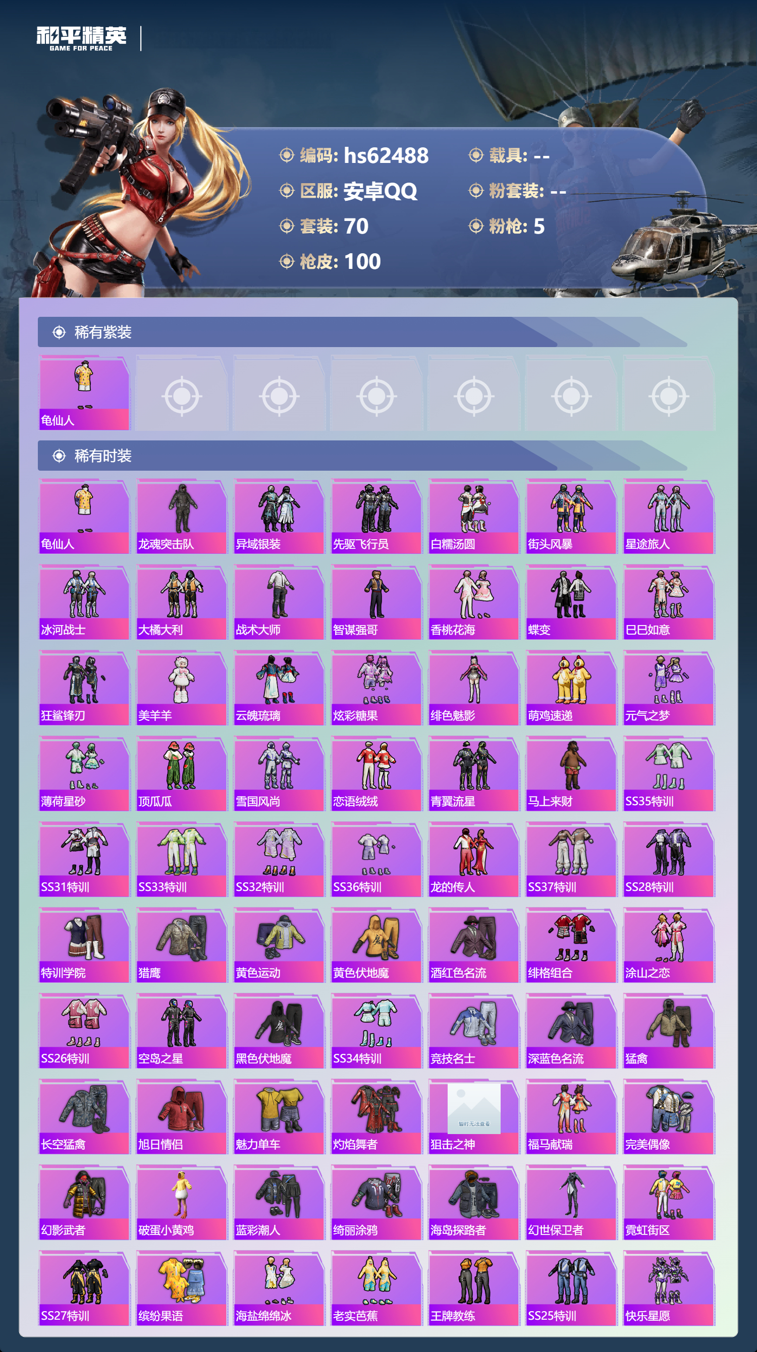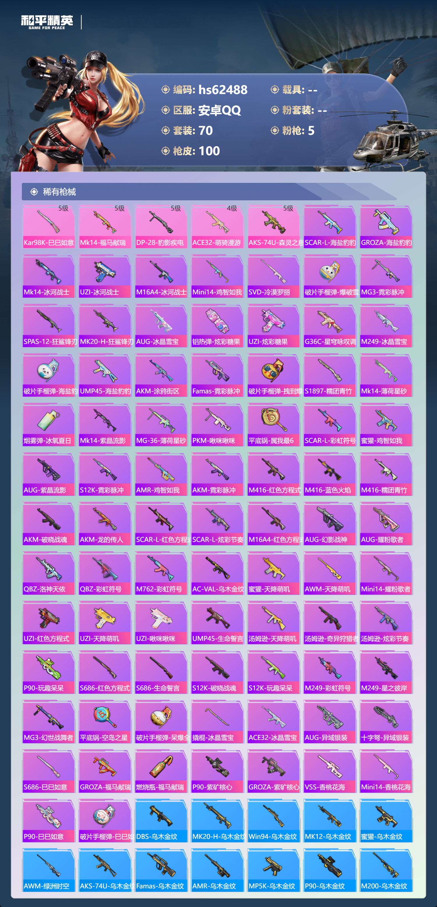 hs62488 安卓手Q-2王牌印记-5特效枪-25882热力值-70套装-100枪皮-1卓越印记