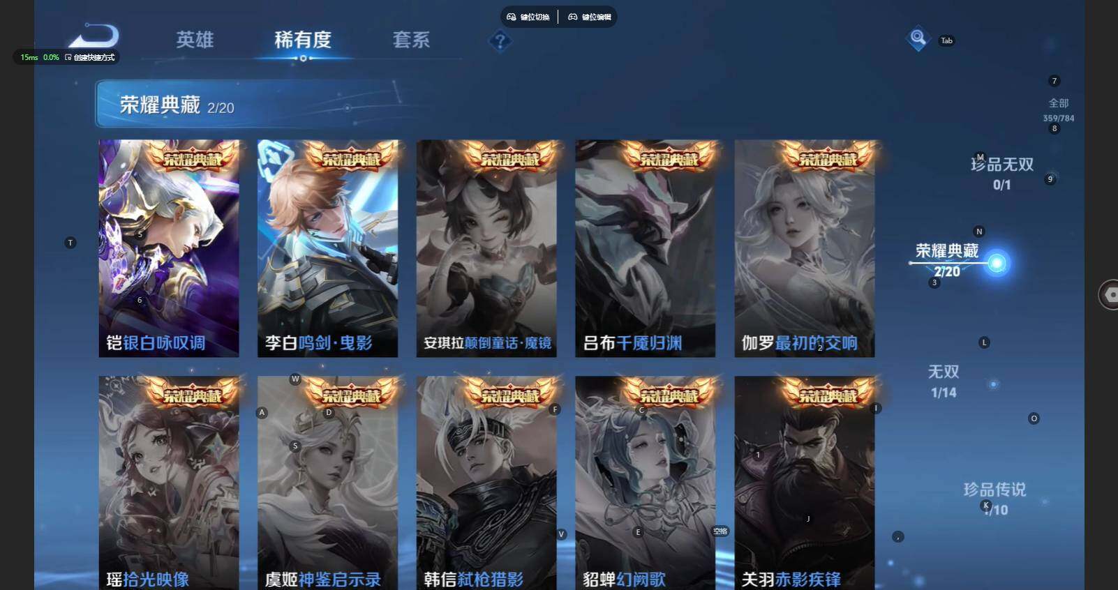 安卓Q-V8-最强王者段位-128英雄-359皮肤-2典藏皮肤-1无双-1珍品传说-20传说-110史诗