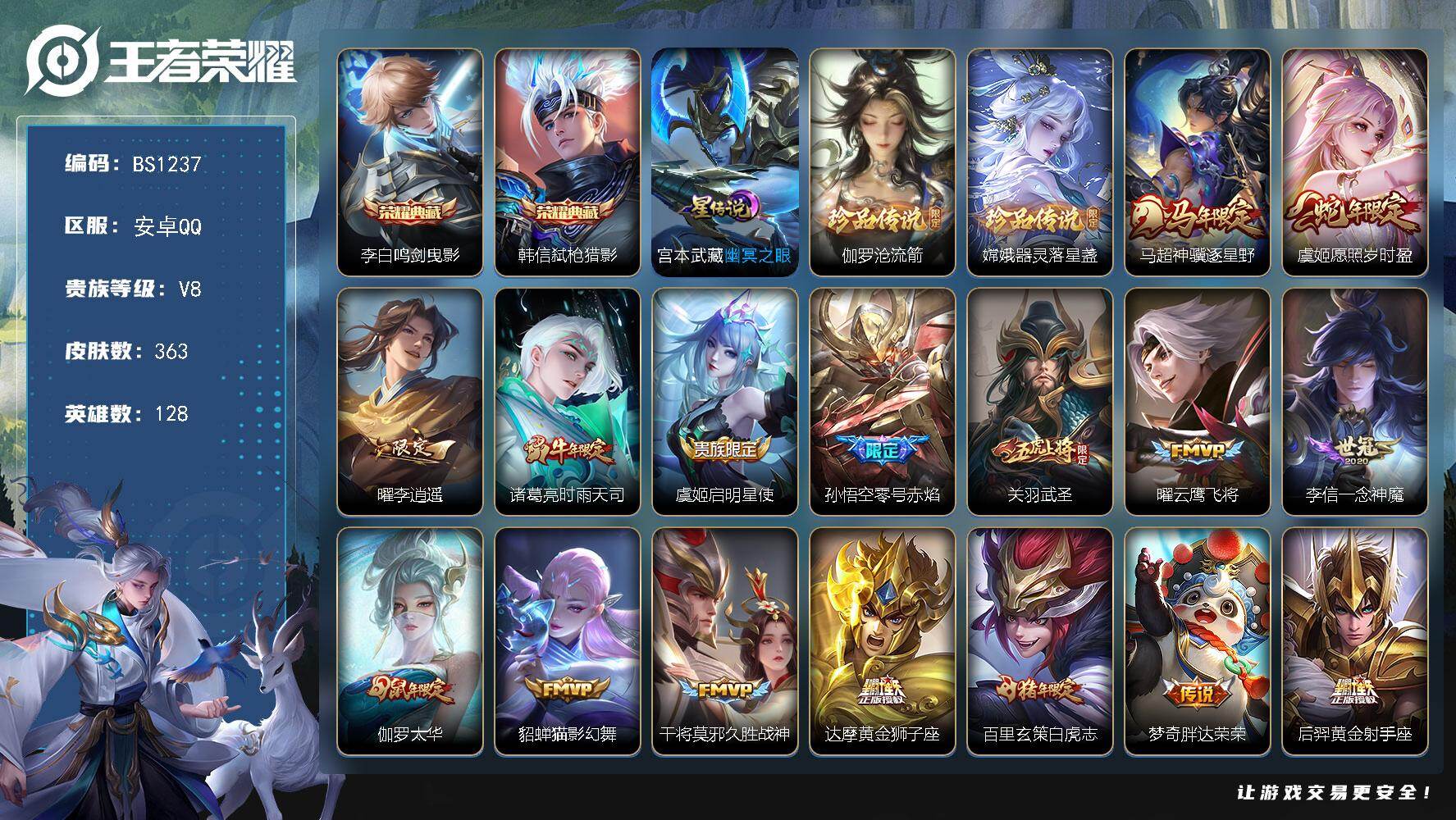 育路40段 金标虞姬!安卓Q-V8-最强王者段位-128英雄-363皮肤-2典藏皮肤-2珍品传说-23传说-106史诗