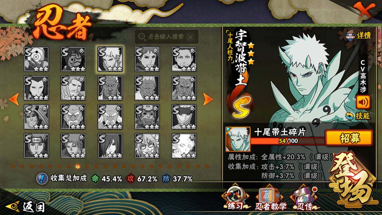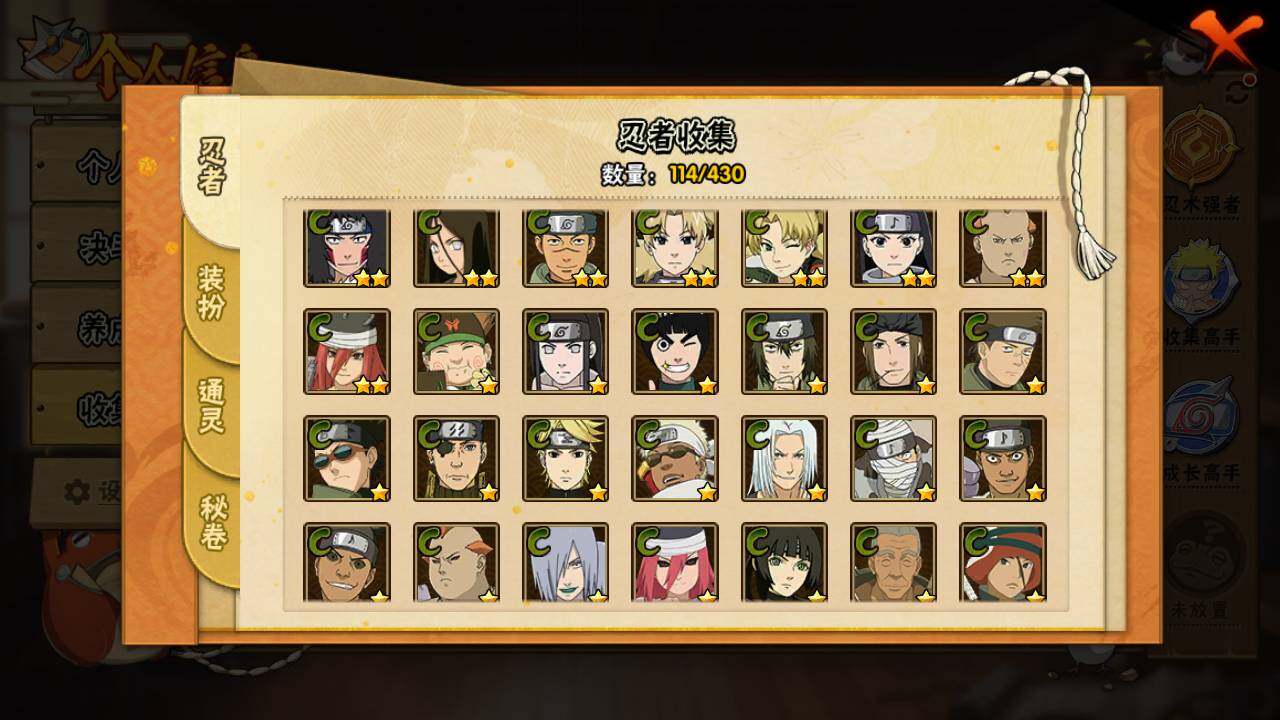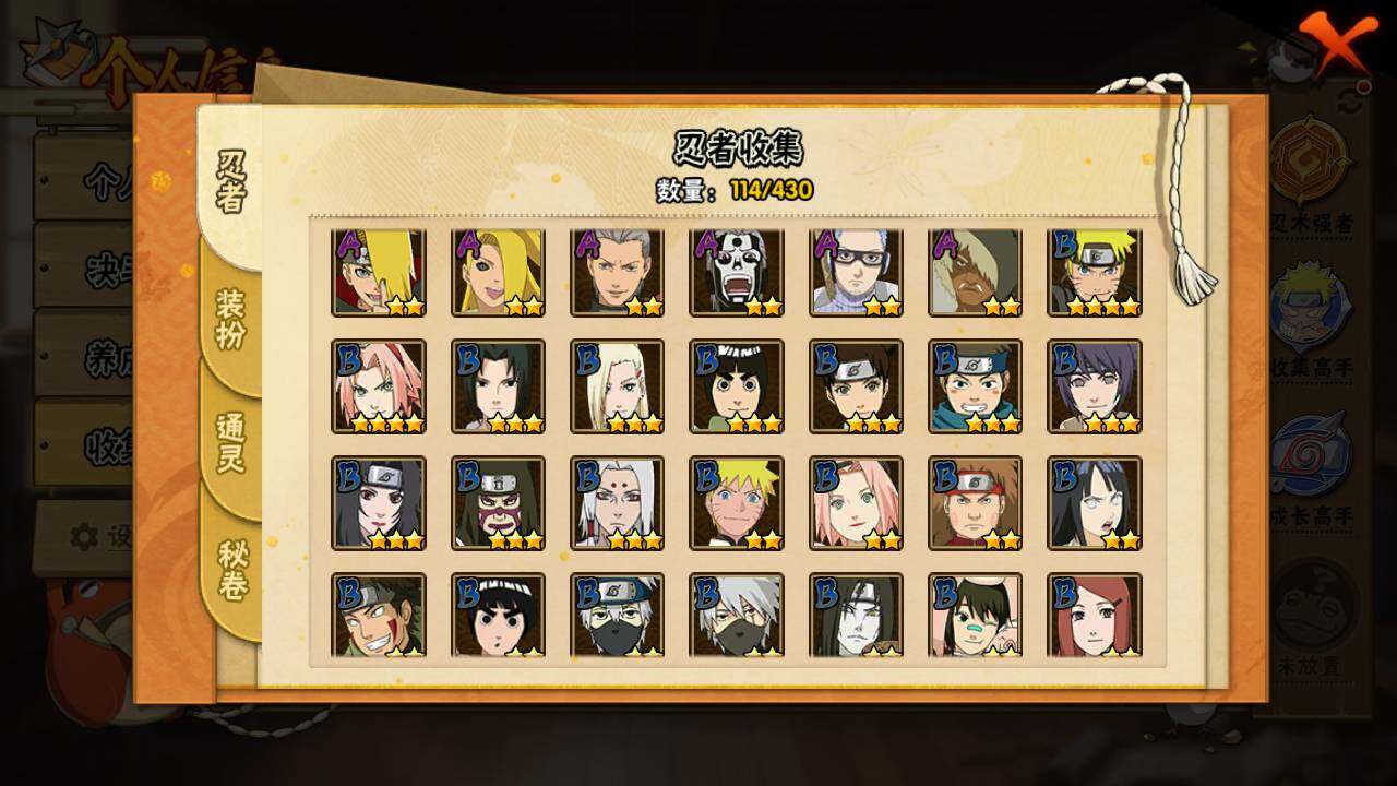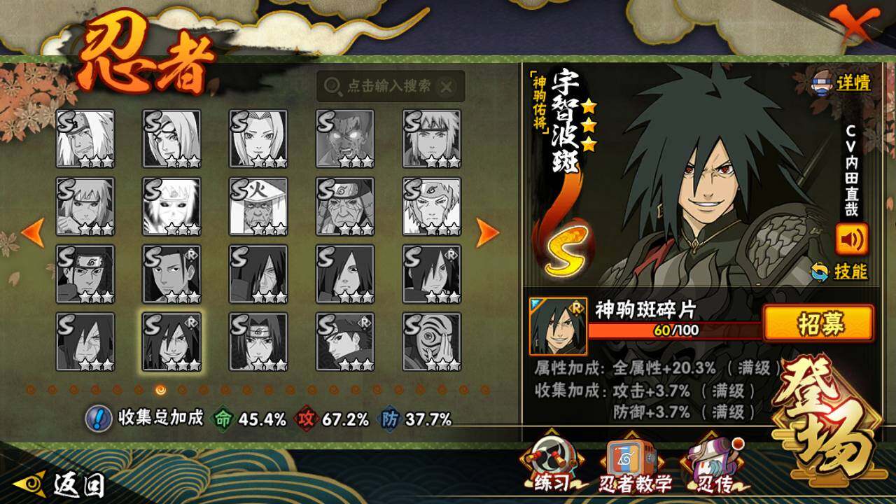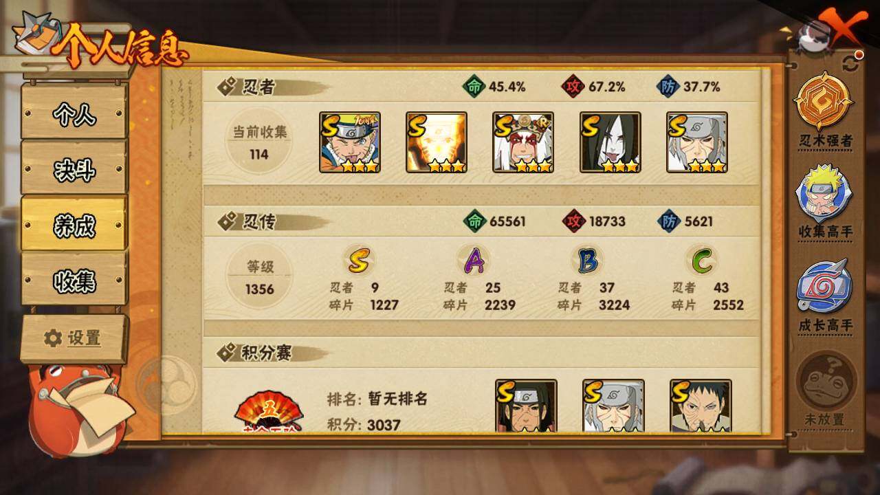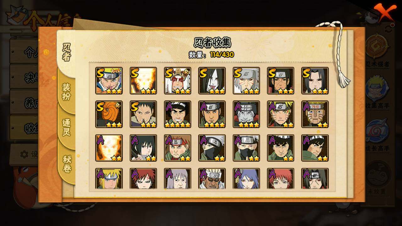 【S级忍者】:千手扉间「秽土转生」(3星),千手柱间「秽土转生」(3星),宇智波鼬「秽土转生」(3星),宇智波带土「忍界大战」(3星),自来也「舞之豪杰」(3星),大蛇丸(3星),漩涡鸣人「九喇嘛连结」(3星),宇智波斑「五影会谈」(3星),漩涡鸣人·宇智波佐助(3星)